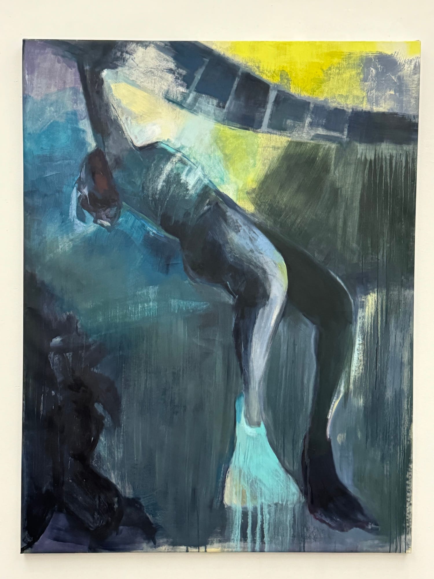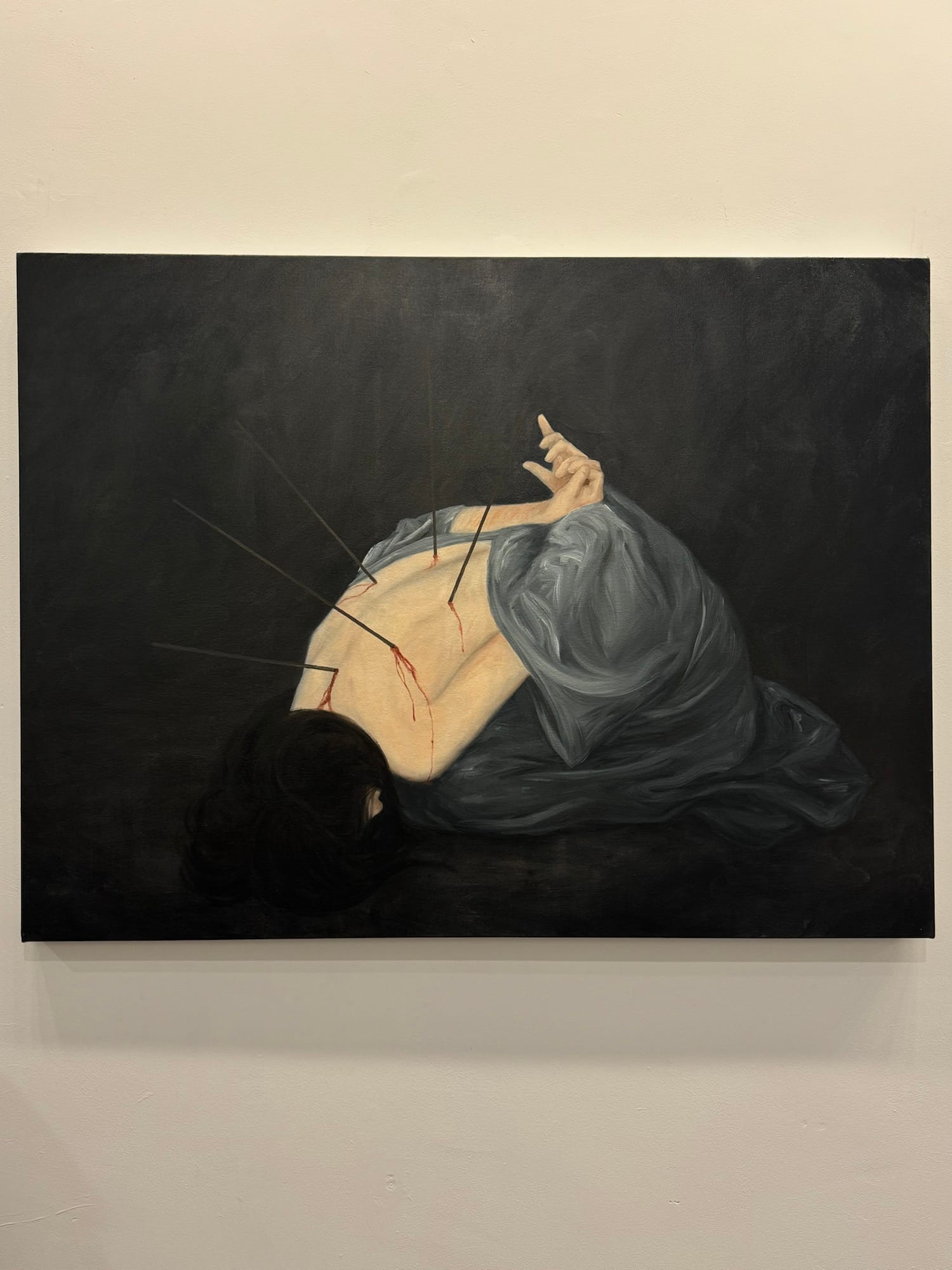 Another standout image of bodily and emotional suffering was “Underwater II” (2024) by Narelle Sissons, a painting of a figure stuck underwater. “For me, it’s about the emotional state of being suspended in water,” the artist noted. With the work, Sissons probes the physical sensation of fighting against drowning as a way into the emotional agony of feeling trapped.