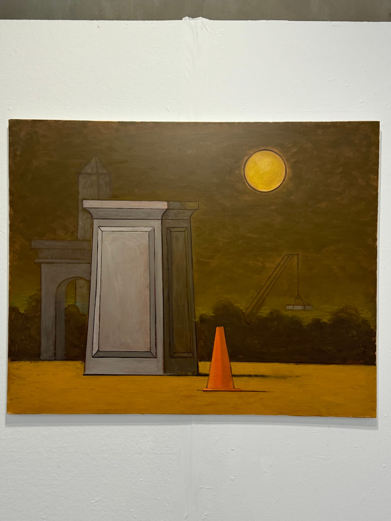 Recalling the work of Giorgio de Chirico and other Metaphysical painters, Sutton Allen uses color to create eerie, atmospheric scenes. He said of the painting “Square” (2024), “I had an idea of a poem between three forms — the empty plinth, the cone, and sun or moon. But then other ideas emerged.” The sky appears polluted and smoggy. Its relationship with the central visual poem is left open to interpretation.