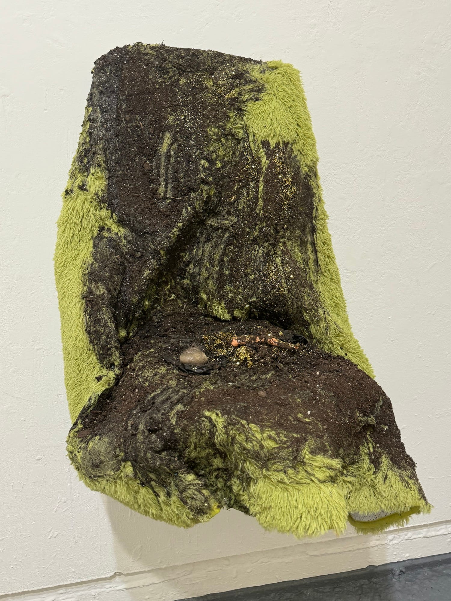 Zipporah Norton’s mixed-media sculpture “Resurrection Stone” (2024) takes a more intimate approach to loss, memorializing the transition from childhood to adolescence. According to the artist, the work “is about giving shame a platform of beauty and dignity.” An important detail is easy to miss: Amid the scattered dirt on the green shag rug, there is a rock with body hair. This autobiographical work invites all of us to revisit puberty — a time when hormones raged, and a new body formed.