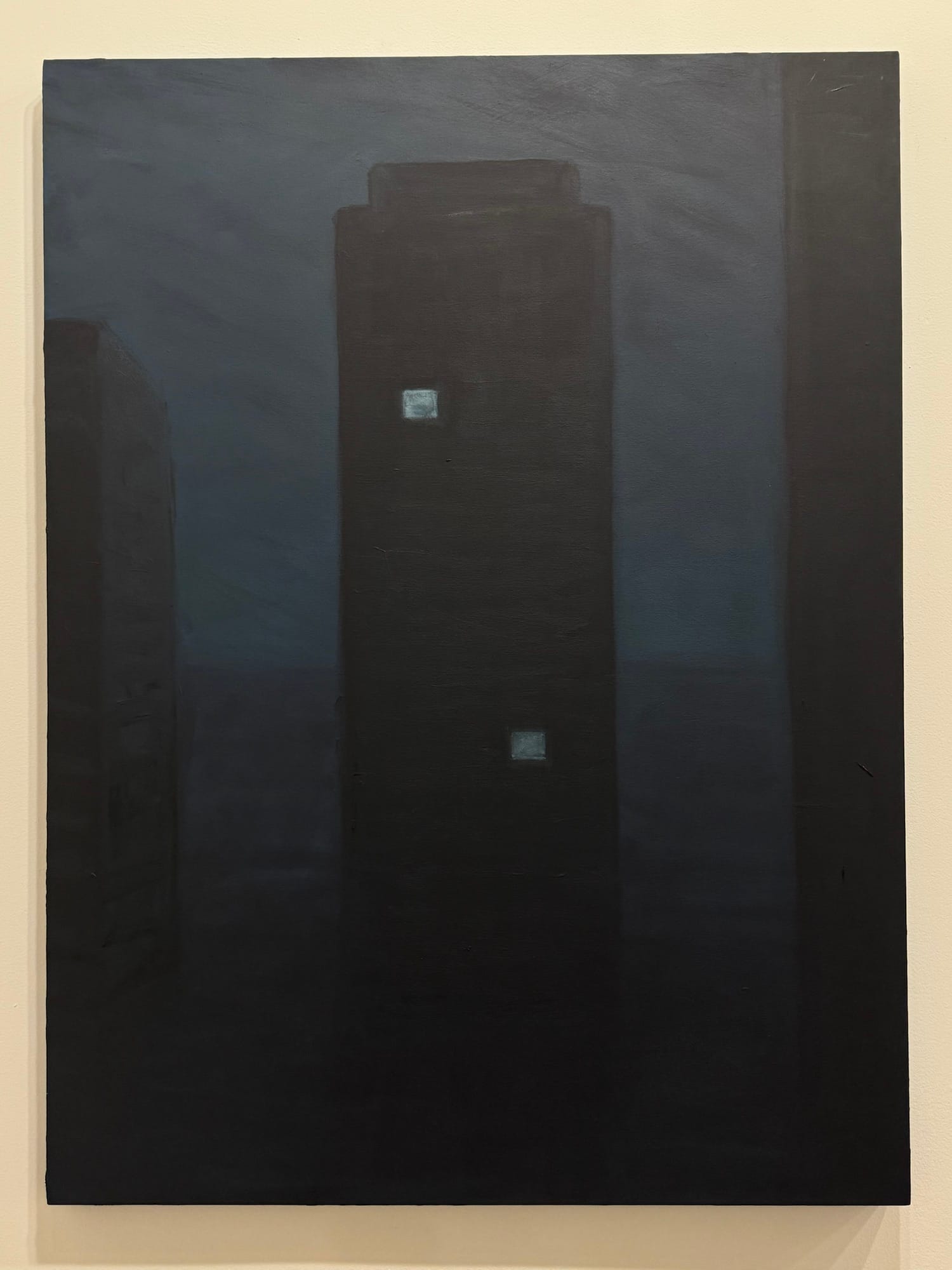 James Kozlik’s work evokes the gravity of the times from a psychological perspective. “My mood about the world has been pretty dark,” the artist explained, referring to his nocturnal landscapes. In “Night Presence #1” (2024), only two windows are illuminated in a residential tower, isolated from one another. At its base, the tower looks as if it might be sinking into water, anticipating how Manhattan will eventually flood due to climate change.