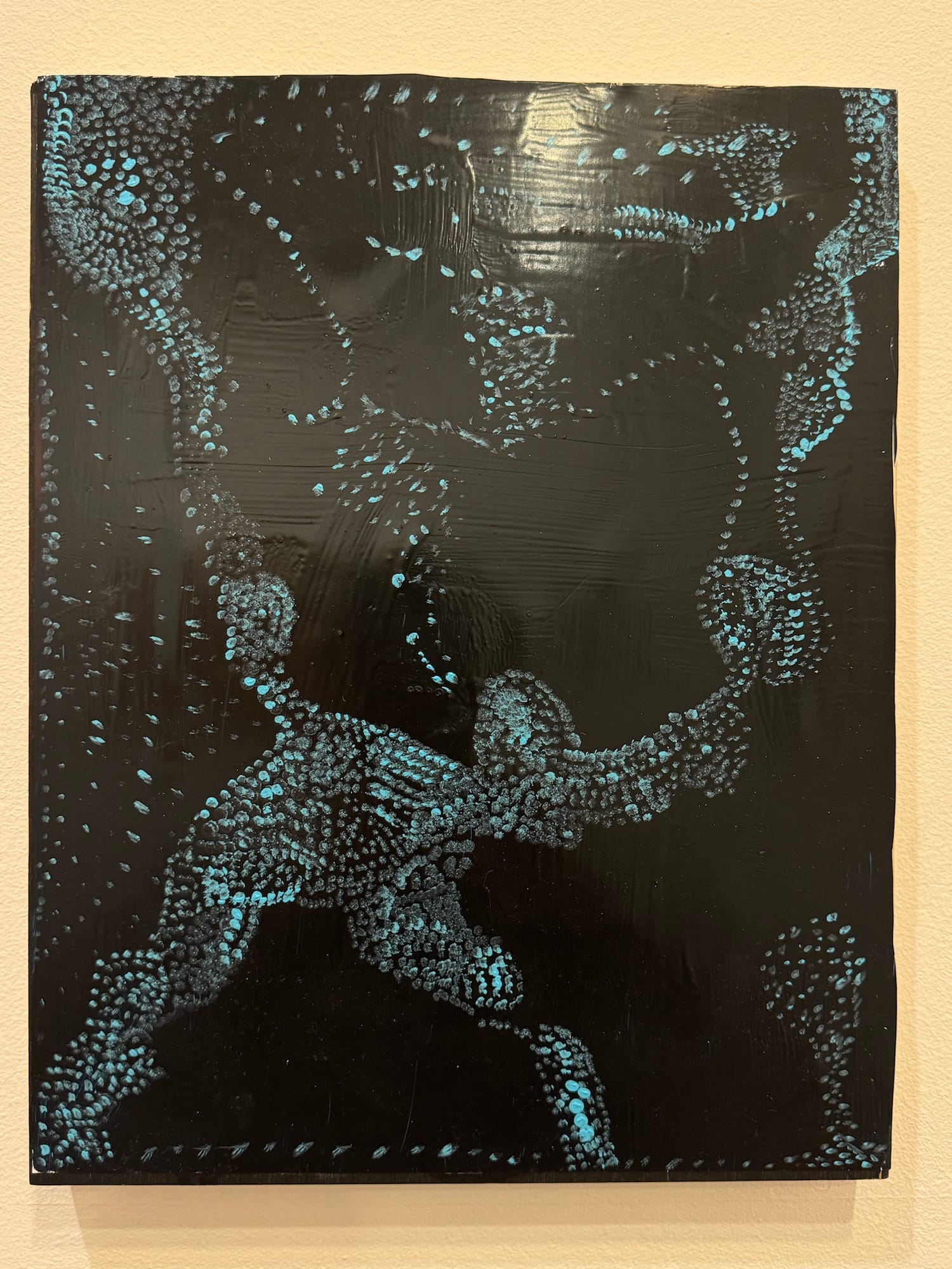 In contrast, Walter Brown’s captivating “Atlas” (2024) reminds us to retain sight of the joys around us. Turquoise fractals glimmer against the black background, providing a moment of iridescence in the dark. Brown’s paintings, as the artist wrote in the exhibition catalog, “represent my reaction to the current world situation in all its complexity, with both its ugliness and beauty.”