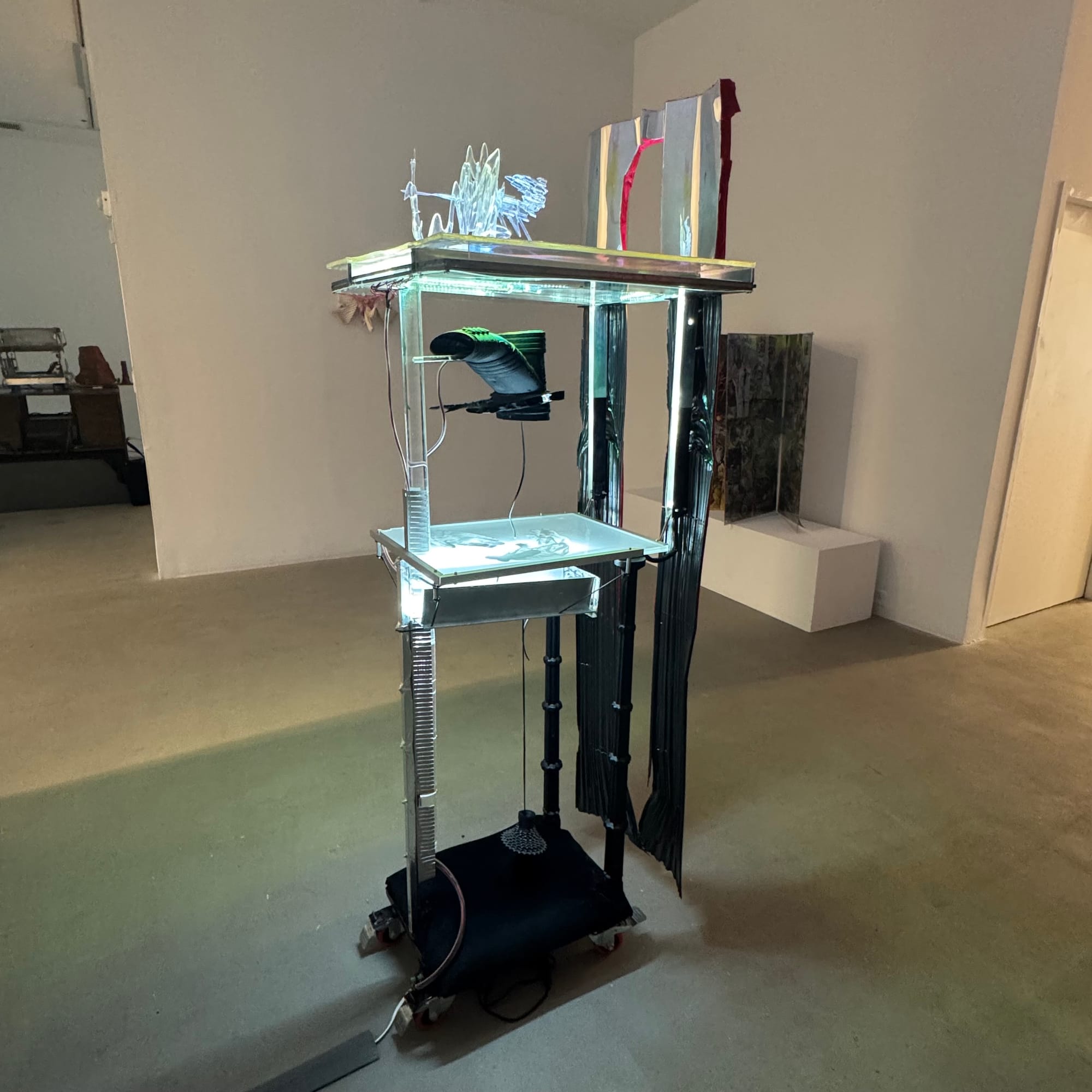 In his sculpture “Dominion” (2025), Nick O’Connell reckons with the limits of what the body can perceive and the ways that its blind spots can unknowingly dominate us. On the top stage of this intentionally enigmatic sculpture is a 3D-printed resin recreation of the famous Roman sculpture the Laocoön, with a twist — only the body parts constricted by the sea serpents are rendered. On the middle tier, a device emits light onto an underlit scanner bed with three discarded plastic gloves. On the bottom, bicycle cogs dangle over a pillow. That element in particular feels intentionally cryptic, as if to signal the limit of what can be gleaned by sight alone.