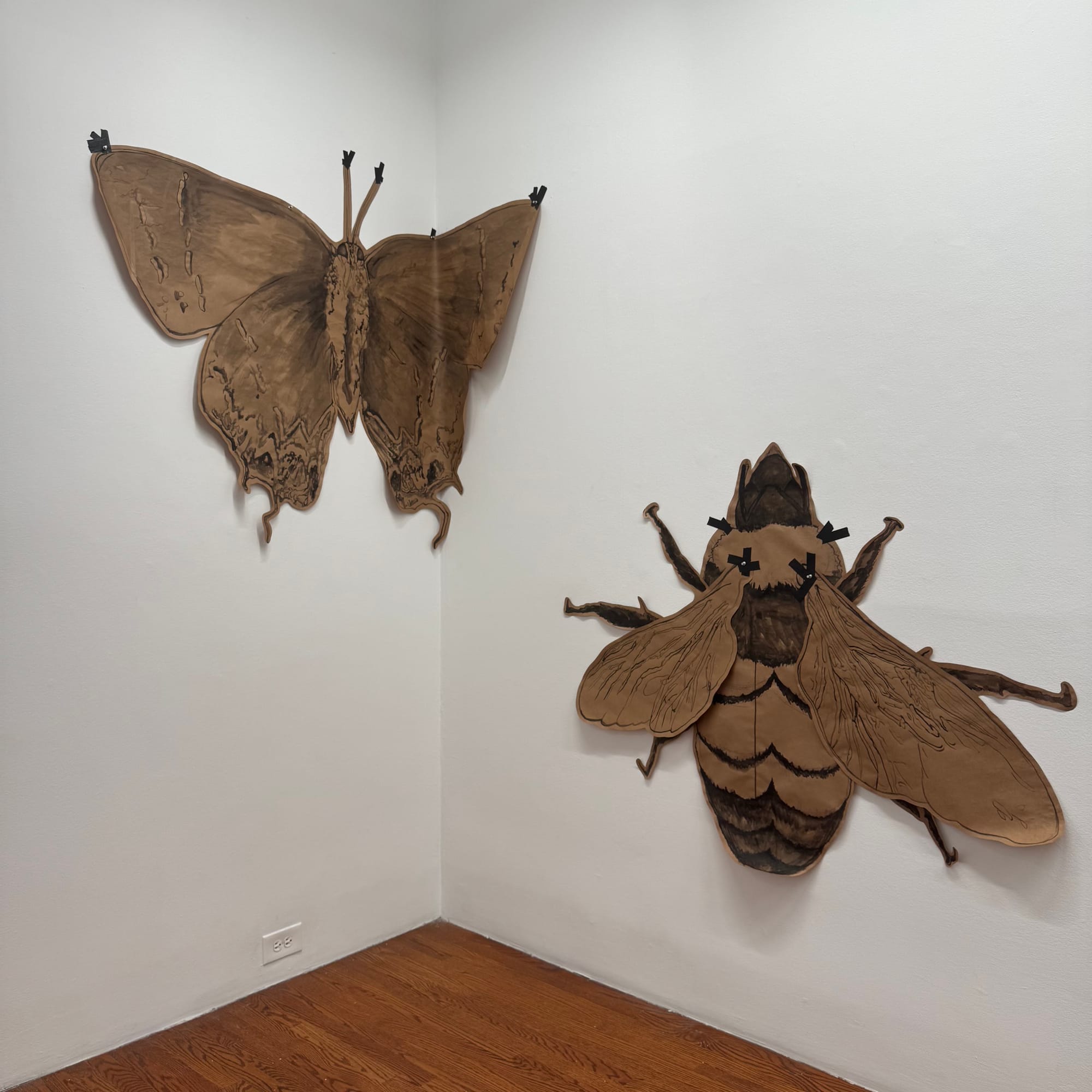 Chloe Mosbacher likewise looks towards the animal kingdom in her drawings of bumblebees, butterflies, and ladybugs, inviting us to ponder these insects' bodies enlarged at 4500%. “I wanted to scale them up to problematize our relationship to them,” Mosbacher explained. Although we depend upon the labor of pollinators for our produce, every species of bee and butterfly depicted is either vulnerable or imperiled in New York State. Before Trump’s election, the monarch butterfly was on track to become designated as a threatened species under the Endangered Species Act; now, that effort has stalled, and conservationists expect a full veto to come. Mosbacher’s drawings ask why many of us take insects for granted when our bodies can’t live without the fresh food they help produce.