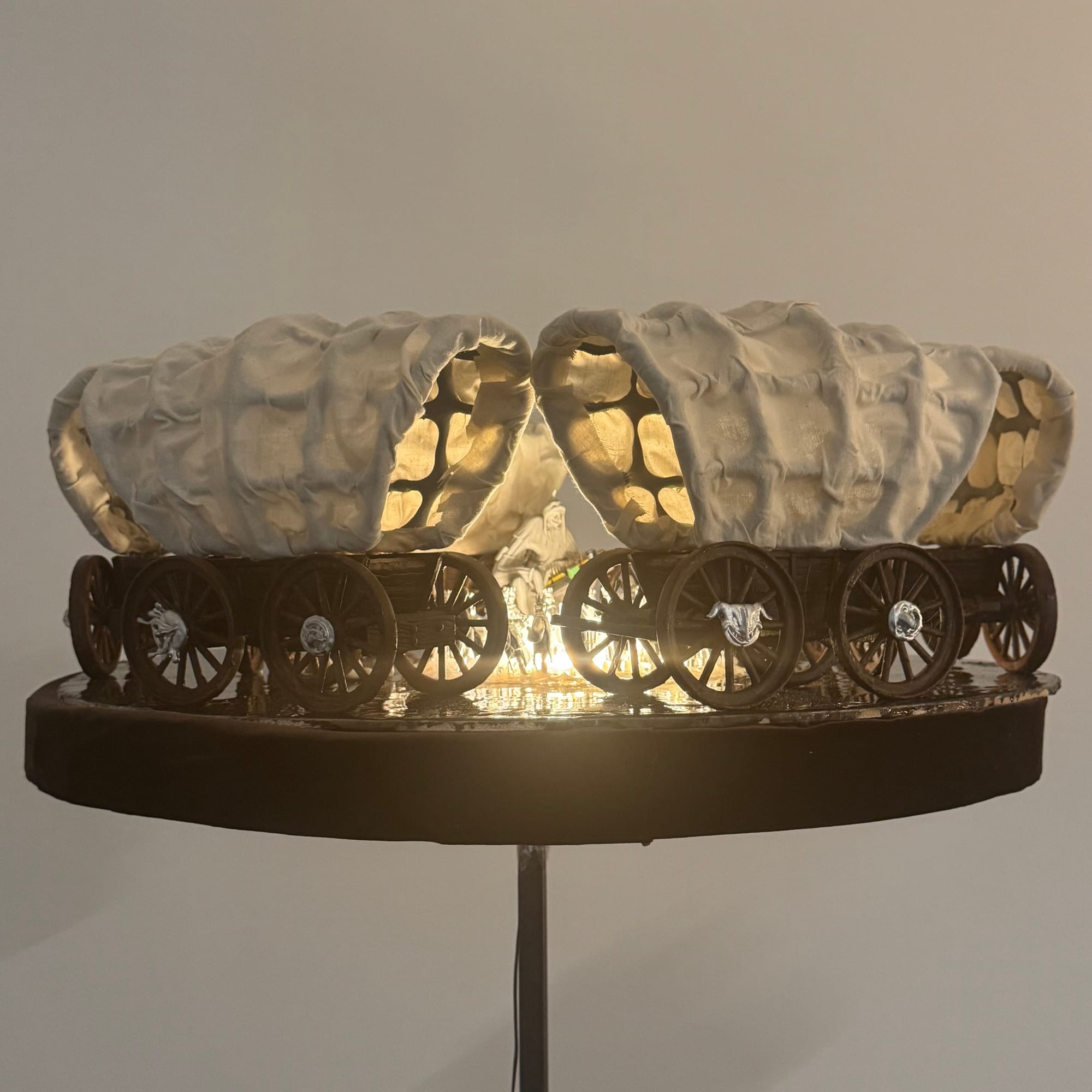 Wyatt Nelson's sculpture "Circling the Wagons" (2025) offers a nuanced critique of colonial herd mentality in the round. His 3-D printed Conestoga wagons invoke the United States’s grisly settler history. Peering through them, one discovers a herd of identical miniature white king figurines encircling glowing silicone like a bonfire. A sinister hooded goblin with a motherboard looms over them, suggesting their obedience. It's a powerful critique of White power and technocapitalism via unorthodox metaphors.