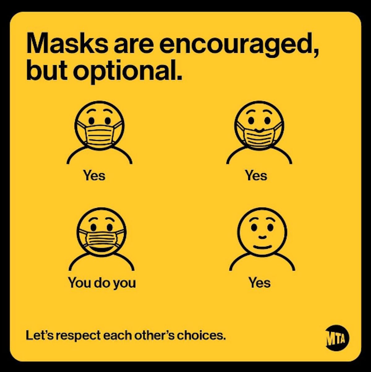 The MTA's new graphic campaign says masks are "encouraged, but optional" and calls upon us all to “respect each other’s choices.” These choices include wearing a mask, wearing a mask the wrong way (“you do you”), and also not wearing a mask at all. If you can’t afford Broadway tickets, just get on the subway, folks, because it’s anything goes!
