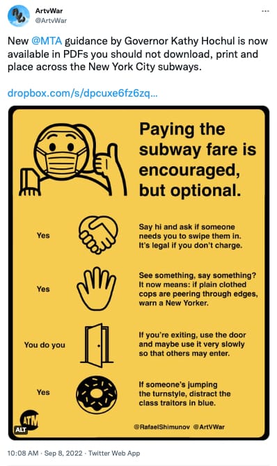 Memes circulating online since the MTA's announcement yesterday satirize the government agency's unbelievable suggestion that riders wear a mask in the center of their face with equally nonsensical interpretations of other activities; for example, discouraging smoking, but also endorsing crack smoking as a "you do you" option, depending on what you're into. And good news: The subway fare is also optional! Well, at least according to one meme.