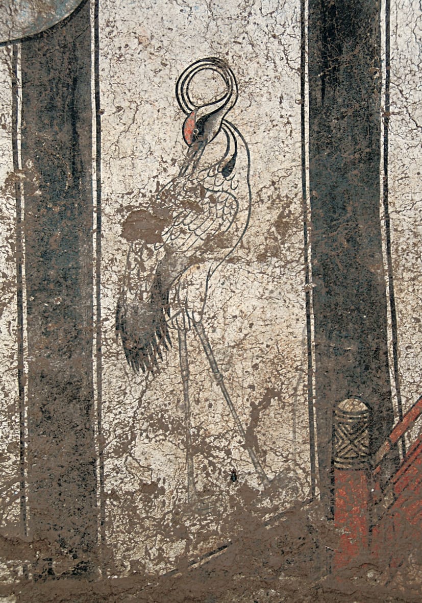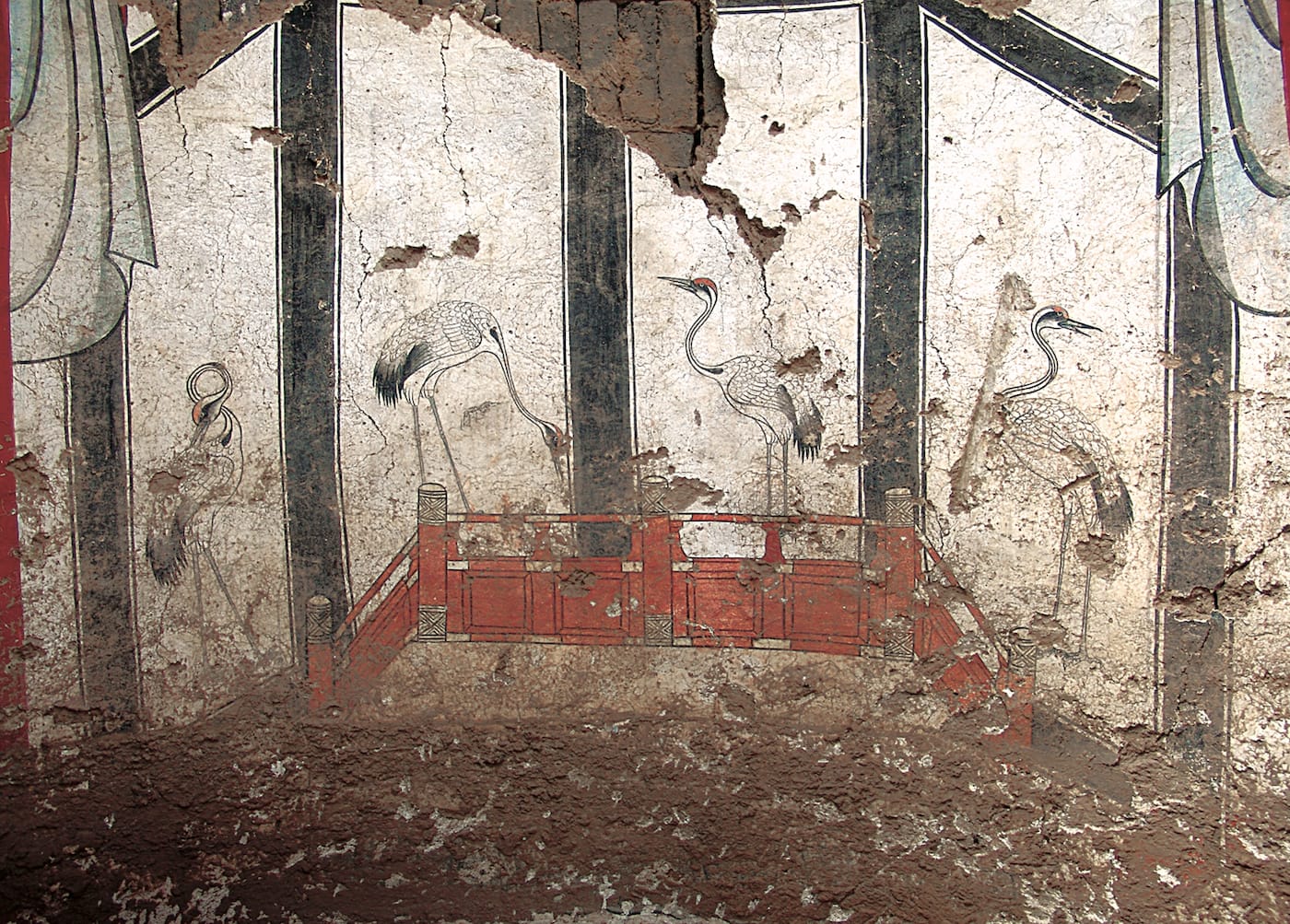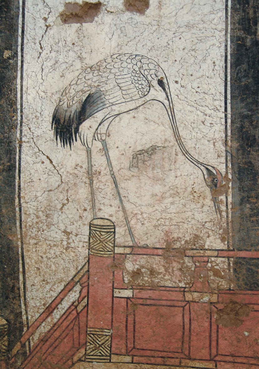 The objects surrounding the figures also make clear that the artists involved took special care to replicate reality. The dishes and jewelry on the table take on all forms, including a white narrow-necked and lidded ewer, red saucers, and tiny hairpins and combs. The interest in portraying variation appears as well in an adjacent, wide mural of four cranes, each elegant and posing in different stances.