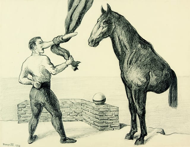 130 of the uncovered pieces are collected in a new book, René Magritte: Newly Discovered Works, Catalogue Raisonné VI. The works range from drawings (previously left out of the catalogue raisonne) like one depiction of a bodiless horse gazing at a man with a very phallic nose (at top) to a painting of a giant soup spoon delicately balanced against the Leaning Tower of Pisa.