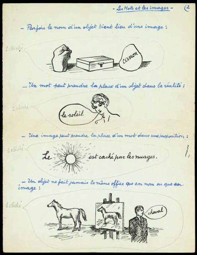Another new discovery is a series of sketches for illustrations that appeared in the publication La Revolution Surrealiste in 1929. The drawings (seen below) lay out Magritte’s philosophical inquiry into meaning and language, with captions running on top of quick line drawings. “An object is not so attached to its name that one cannot find for it another one which is more suitable,” he writes next to a sketch of a leaf labeled “Le Canon” (the canon).