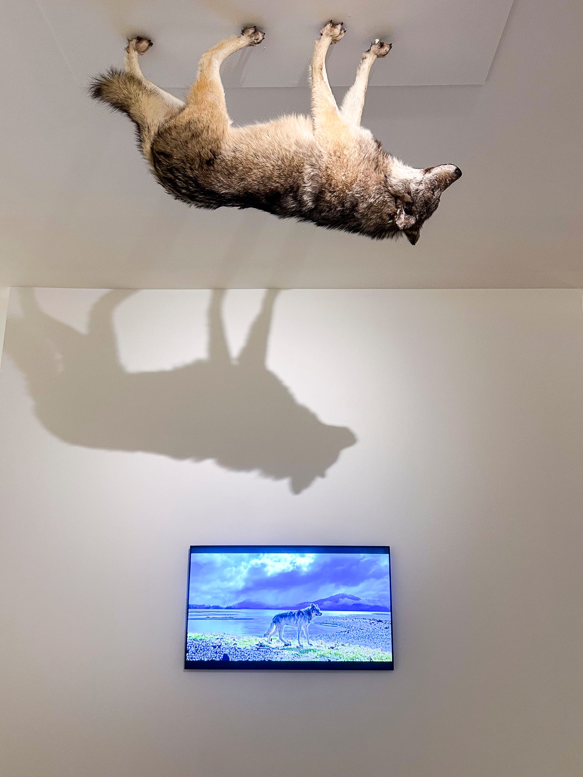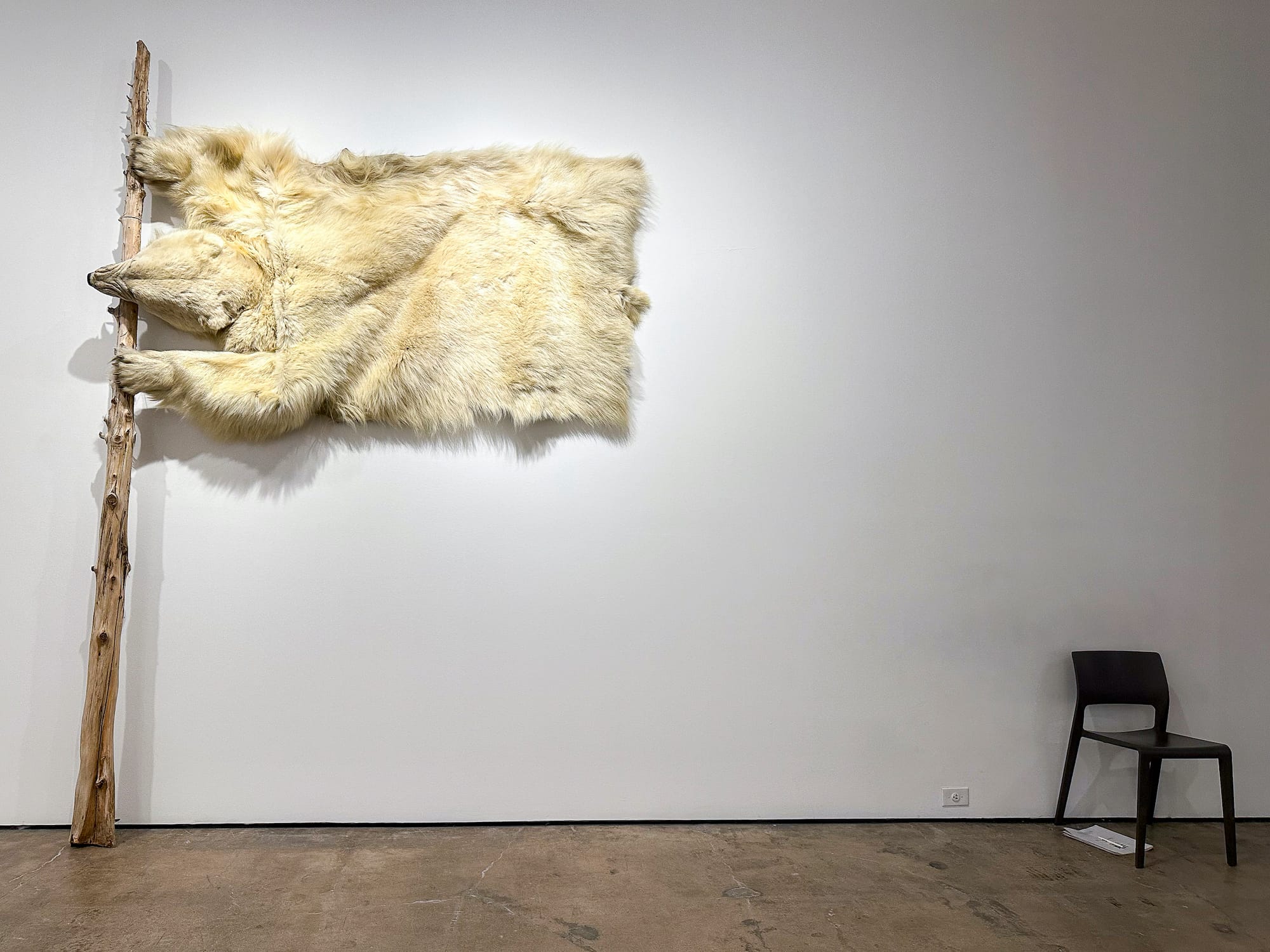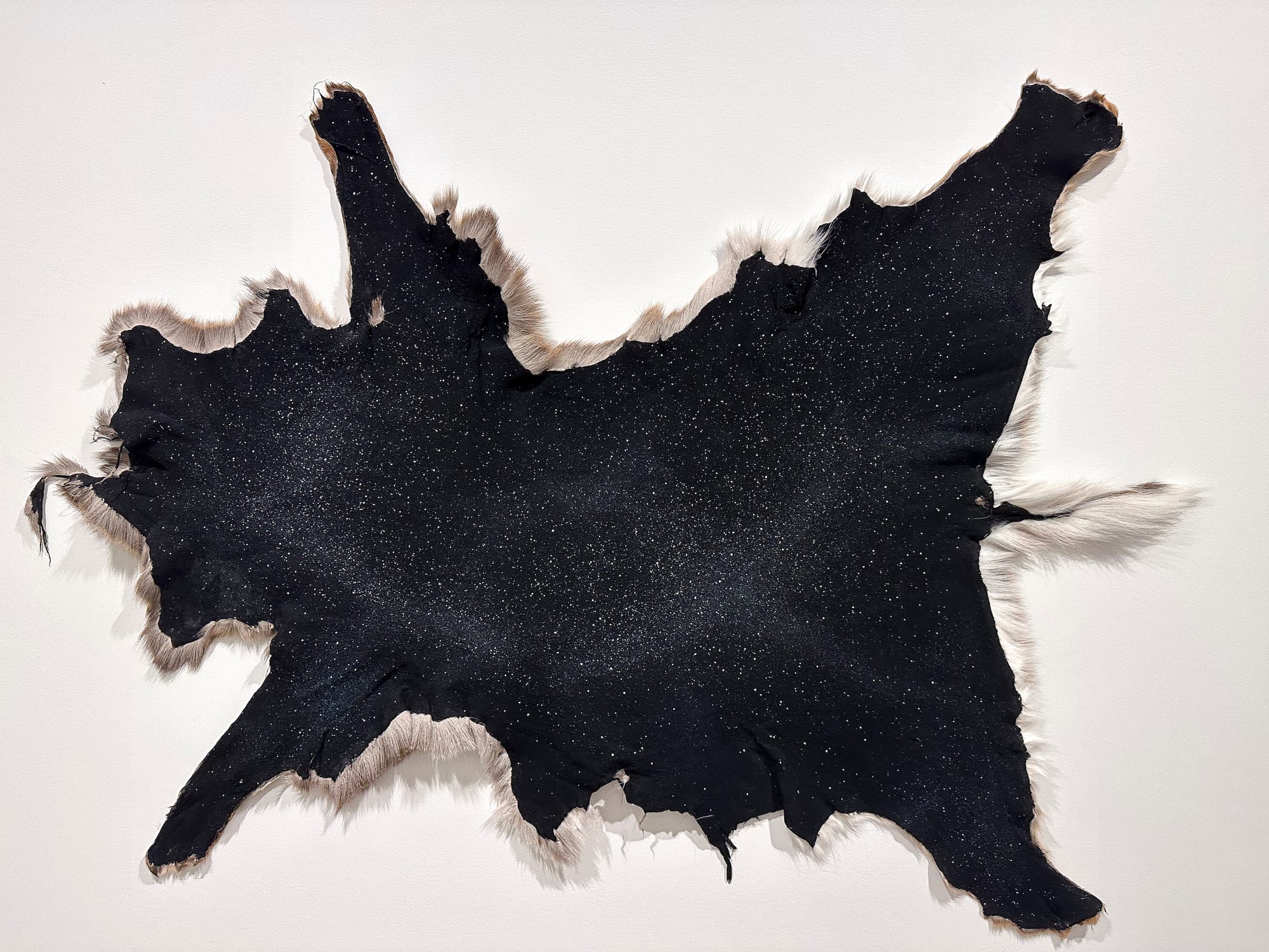 The main gallery contains the series Architecture of Return, Escape, three mounted animal hides whose undersides are painted in dark architect’s blue and white. They illustrate the floor plans of major US museums that hold substantial collections of Indigenous artifacts, remains, and ceremonial objects. Embroidered in red thread, each floor plan also shows a visitor’s escape route from the rooms containing Indigenous collections, in order to repatriate these to the communities from which they were stolen. It’s as if Galanin has created a treasure map to steal back what was plundered, and return it to its communities. In an exhibition opening conversation between Galanin and scholar Joseph M. Pierce, the artist was asked what his hope for the Architecture of Return series was. Galanin replied: