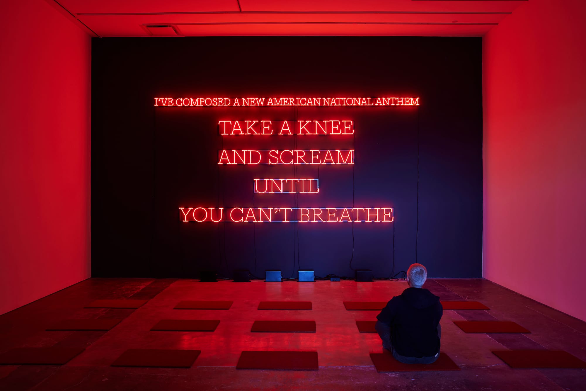 From the building’s entrance, visitors are beckoned into a room lit by a buzzing red neon sign set against a large black wall. The text to “Neon American Anthem (red)" reads: “I’VE COMPOSED A NEW AMERICAN NATIONAL ANTHEM: TAKE A KNEE AND SCREAM UNTIL YOU CAN’T BREATHE.” Many viewers see the Instagrammable wall and take the imperative to mean instead “take a selfie here.” I can’t help but wonder if and how many people follow the artwork’s directive.