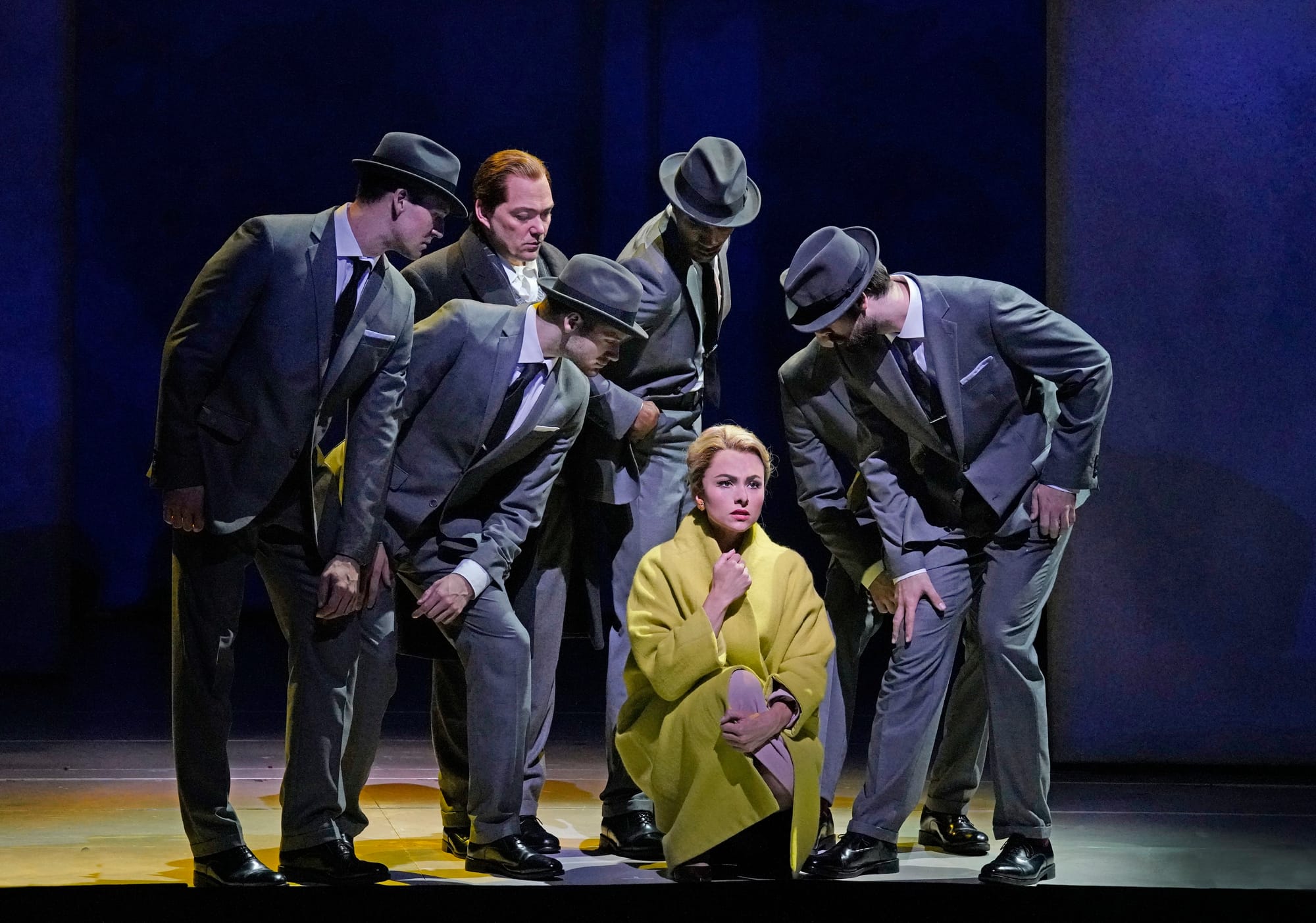 With music by Nico Muhly and libretto by Nicholas Wright, the Met’s North American premiere of Marnie, based on the Winston Graham novel (which Alfred Hitchcock made into a film of the same name), takes a more adventurous direction by adding elements suited specifically to the stage. Most notably, Isabel Leonard in the title role is frequently accompanied by four Shadow Marnies, each dressed in a different color and singing with a spooky lack of vibrato, who highlight her inner conflict and octopus-like talent for disguise. Another successful feature is the group of silent male dancers dressed as menacing noir detectives who appear in various scenes to heighten the drama.