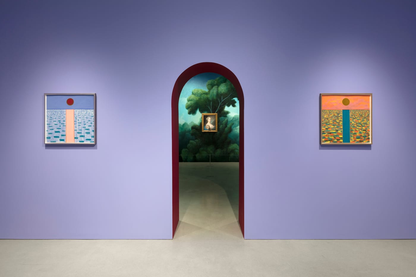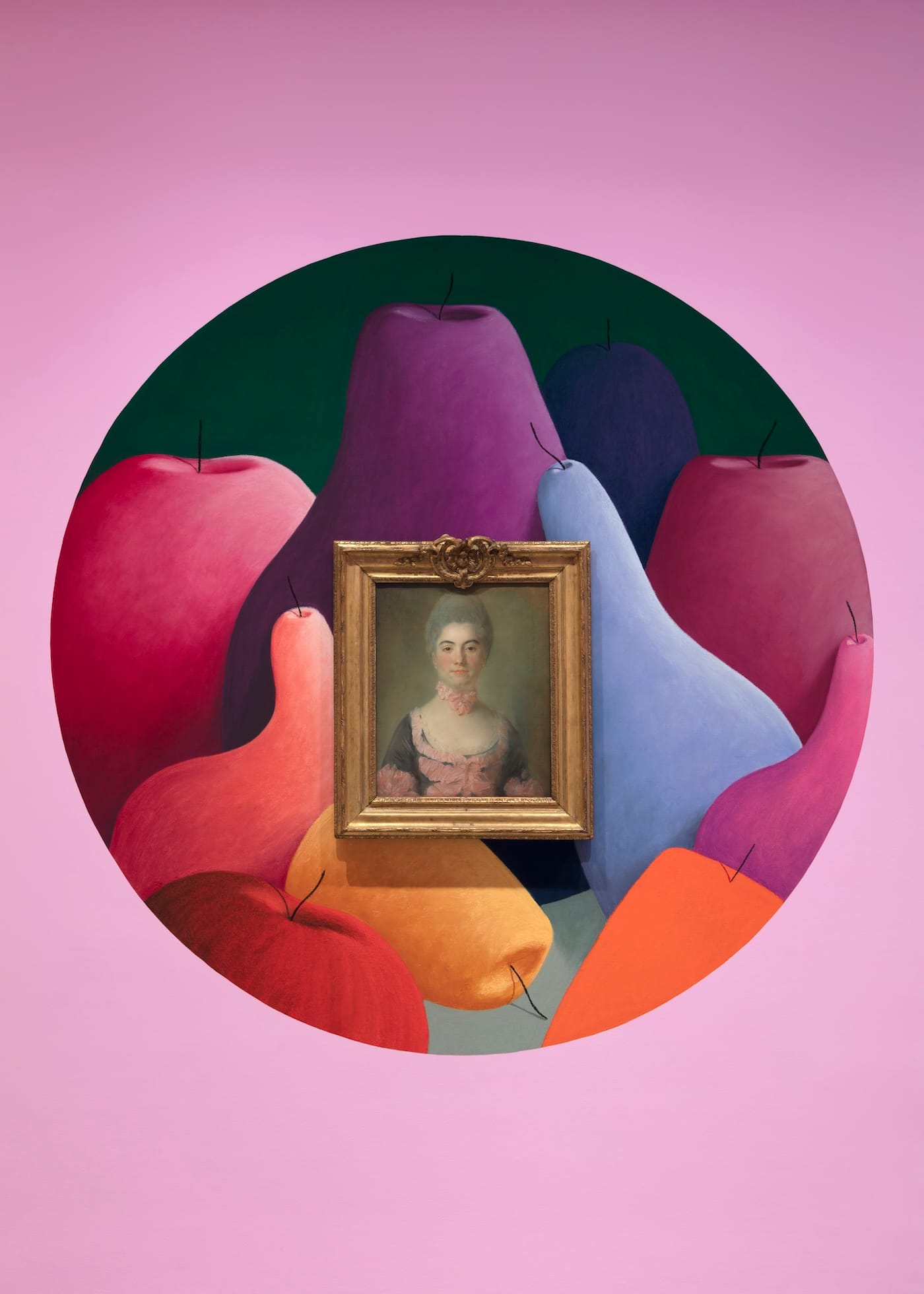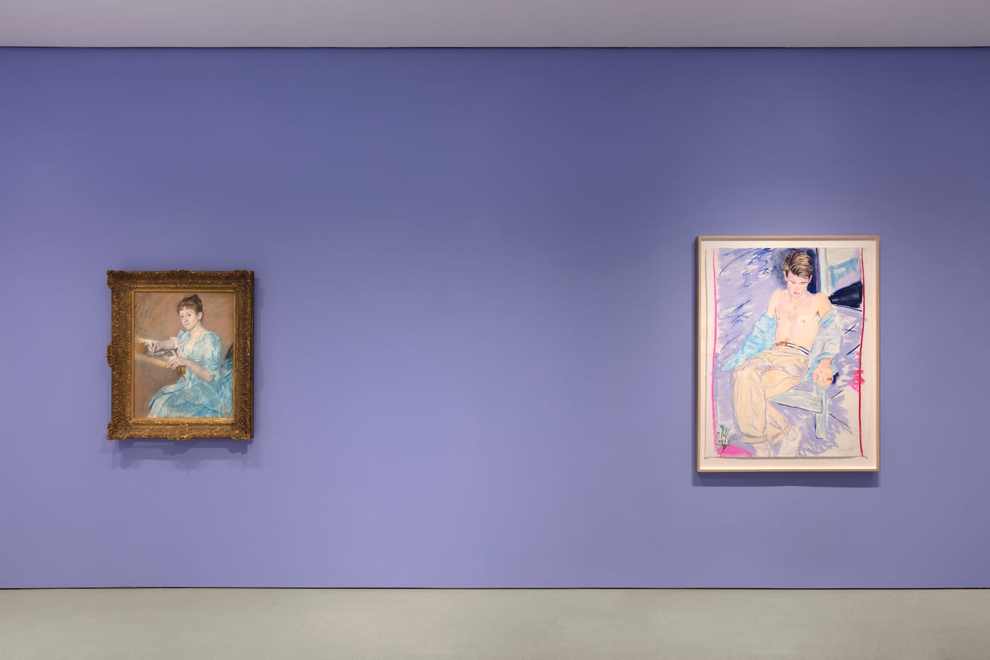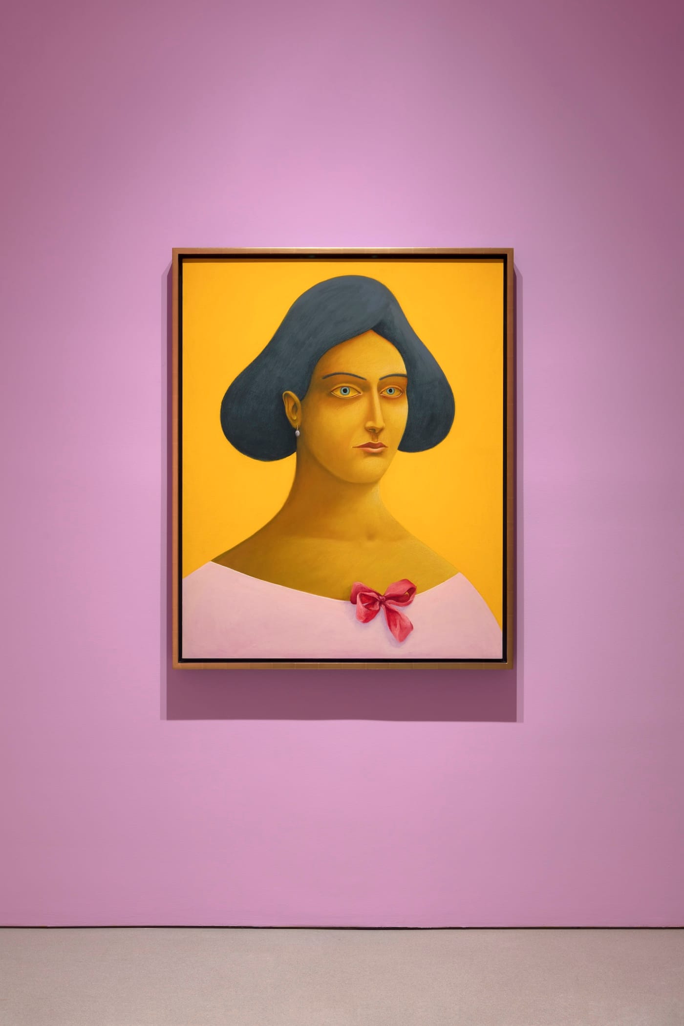 Party presents his own work in context with pastels from the past three centuries, from circa 1720 through 2019, within a unique exhibition design marked by wall colors that bathe each gallery in an evocative, unexpected, at times breathtaking light. To hell with the white cube; this exhibition opens in bubblegum pink, where Party’s “Portrait with Pink Bows” (2019) radiates marigold.