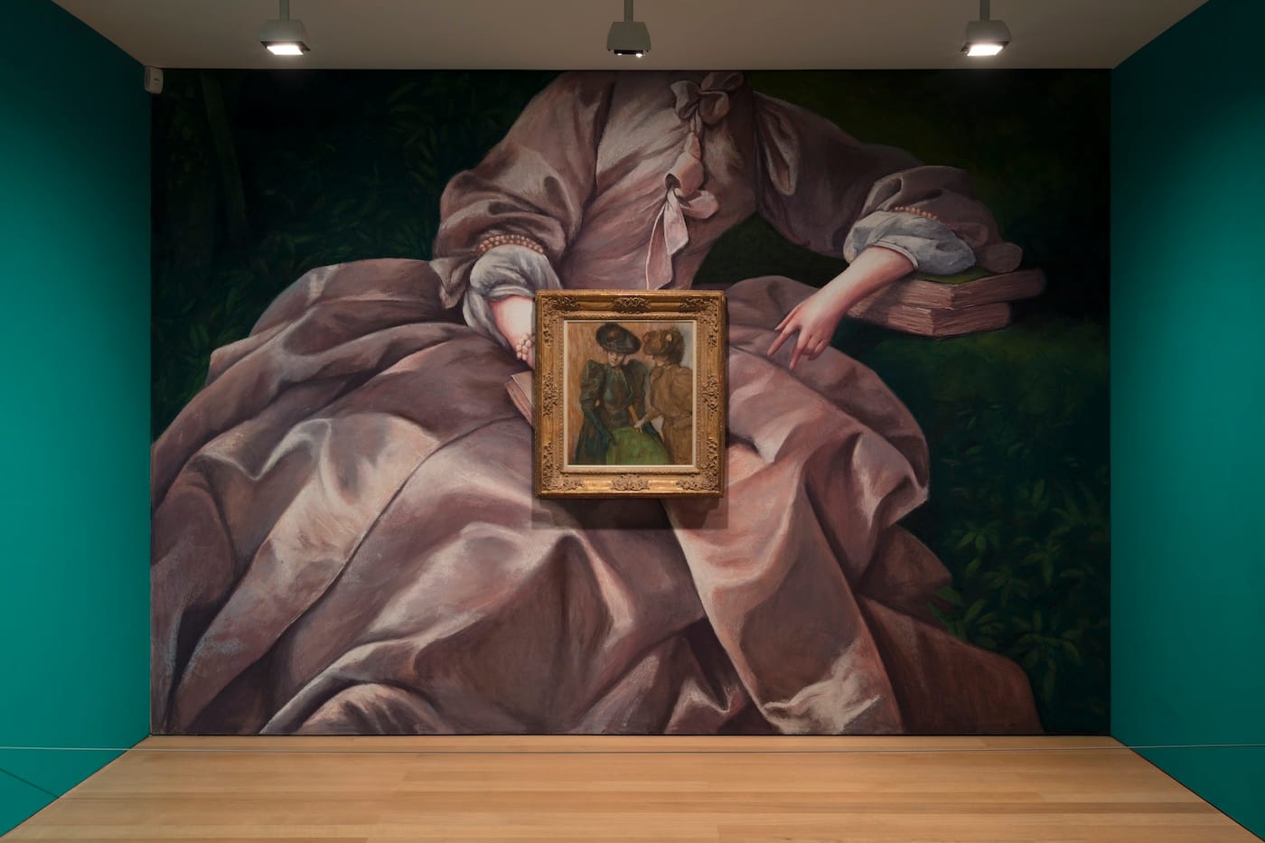 In an exquisite navy-teal room straight out of Stephen Frears’s Dangerous Liaisons (1988), a squadron of resplendent geometric semi-abstractions by the young painter Loie Hollowell hang across from Edgar Degas’s “The Conversation” (1895), itself luminous on a wall of pink sateen shaded with umber and tinted like silk.