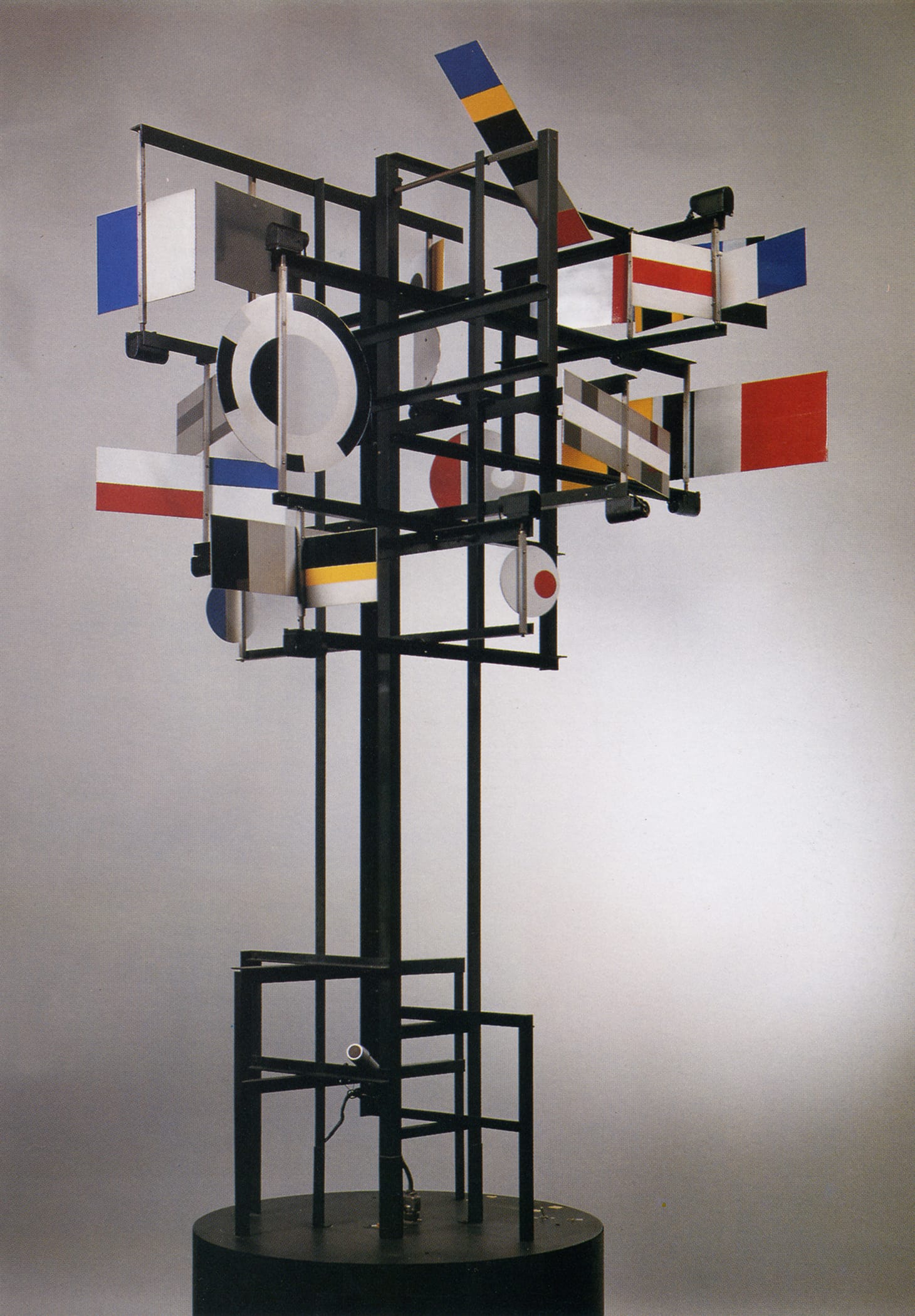 In terms of formulating a creative epistemology, Schöffer’s interactive-oriented formalist output can be considered in terms of a combination of the vibrant dynamics found in Yves Klein’s fête of the virtual void and the mechanical dynamism originally initiated by the Cubo-Futurists’ idea of automation and robotics, ala Fernand Léger. This urge towards the virtual-run-robot (functional software/hardware interaction) was intensified and solidified by the general impact of Constructivism in sectors of the Paris art world, as art historian Frank Popper has abundantly documented. Key here are artist-tech types such as Naum Gabo, Anton Pevsner, Ludwig Hirschfeld-Mack, and the techno-visionary Moholy-Nagy. Indeed Moholy-Nagy’s 1947 book Vision in Motion — and of course his “Light Space Modulator” (1923-30) — clearly prepare and contextualize Schöffer’s oeuvre, as well as that of Takis’s and Pol Bury’s artistic dialogue between machine, light, shadow and motion.