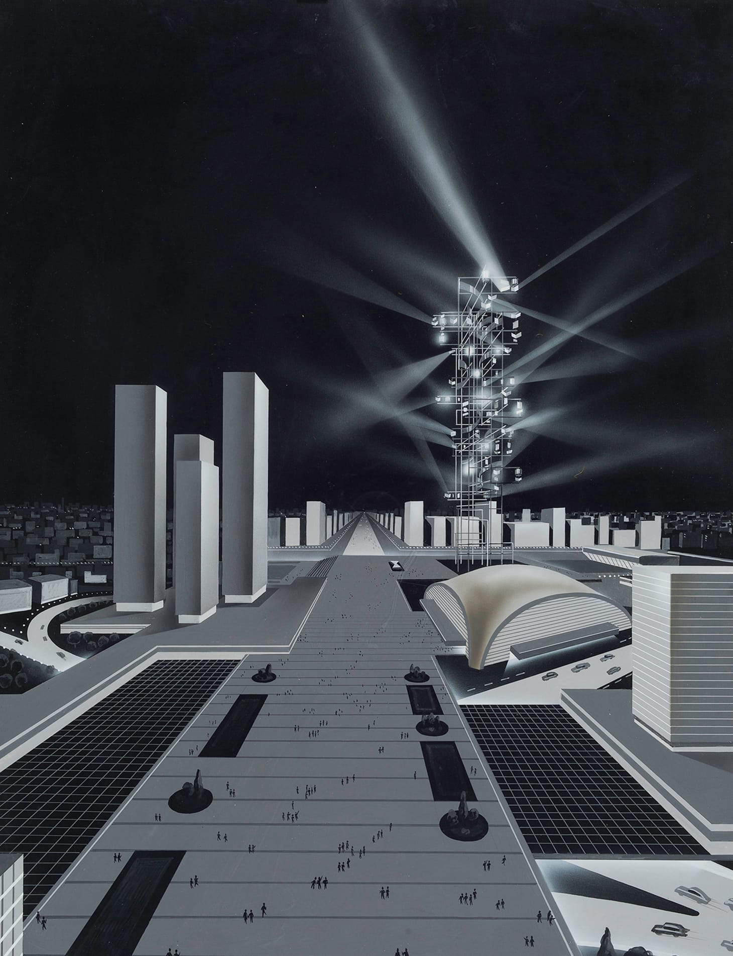 I guess meglomania might be alleged against his 1969 book La ville cybernétique (The Cybernetic City) — containing his plan for an interactive gesamtkunstwerk total-artwork based on smart towers awash in light and motion – but besides the Voom-Voom room, the closest he got to that was the fifty six meters high “Tour Spatiodynamique et Cybernétique” (Spatio-dynamic and Cybernetic Tower, 1961) which was constructed in Liege with sixty-six revolving mirrors. Schöffer’s ever-sensing connected cybernetic city concept is all-at-once kitschy, way-too-real terrifying, and presciently breathtaking.