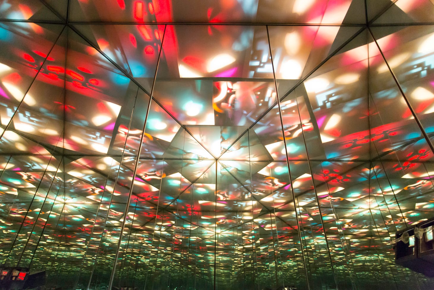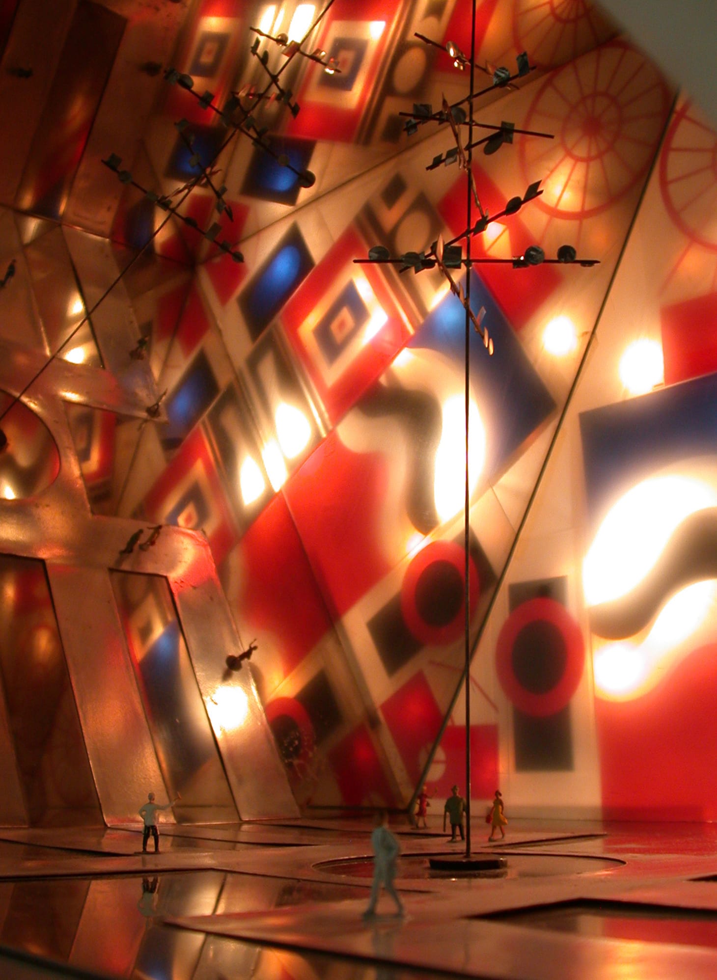 But when you cut through the pioneer cybernetic presumptions and tired notions of artists and dancers as robots, Nicolas Schöffer Retroprospective, in actuality, is a pleasant encounter with mesmerizing light shows. Everywhere refracted psychedelic colored lights bounce off revolving moving polished metal forms, casting slightly morphing lights and shadows: overwhelming and immersing the viewers’ eyes in shifting color. In that respect, Schöffer succeeded, like Moholy-Nagy et al, with opening up the static three-dimensional sculptural form to a fourth dimension of time and motion.