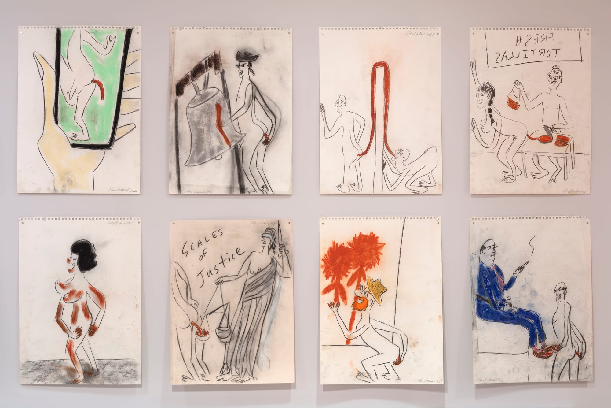 Any feeling of unfulfillment, however, dissipates once you climb the stairs to Boadwee’s floor. Upon further thought, it might’ve been a clever strategy by Eisenman to consciously underwhelm the viewer, in her desire to truly highlight her friend. An impressive installation of Boadwee’s drawings from 2016-2020, most of them directly ripped from the sketchbook, fill the walls and vitrines across several rooms. Contrary to the laconic distance experienced on Eisenman’s floor, Boadwee’s radiates a frenetic energy that stimulates the senses. The drawings depict a variety of cartoon-like figures (many of them self-portraits) engaging in a variety of activities involving shit: Spiderman shits a spiderweb, chefs shit into sushi rolls, artists smear shit onto canvas, shit is molded into fresh tortillas and donuts, numerous people eat each other’s ass, and a few times shitting even takes place into a toilet. The dirty content of the drawings is heightened by their slightly dirty physical appearance, with fingerprints and other ambiguous stains left behind on the paper surface. A true shit show, of the finest quality, if there ever was one — and what better metaphor for the year we just waved goodbye.
