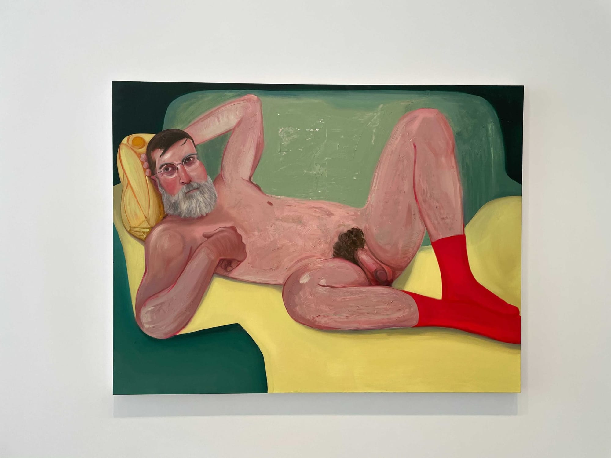 Spanning two floors, occupied by one artist each, the exhibition begins with Eisenman — undoubtedly the main draw for many seeking out this show, myself included. Yet the presentation is hardly satisfying; a rather random selection of works dating from 1993 to 2020, it lacks a clear angle or visual dialogue, and appears somewhat disjointed. For those familiar with Eisenman’s practice, it adds little more than the welcome chuckle at the slapstick humor for which she is known. The highlight, surely, is a tender portrait of an almost nude Boadwee, who kept his red socks on, reclined on a yellow couch. Standing in front of it, I can almost hear Kate Winslet whispering: “Draw me like one of your French girls.”