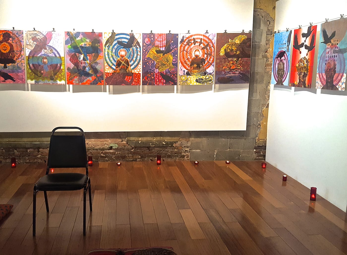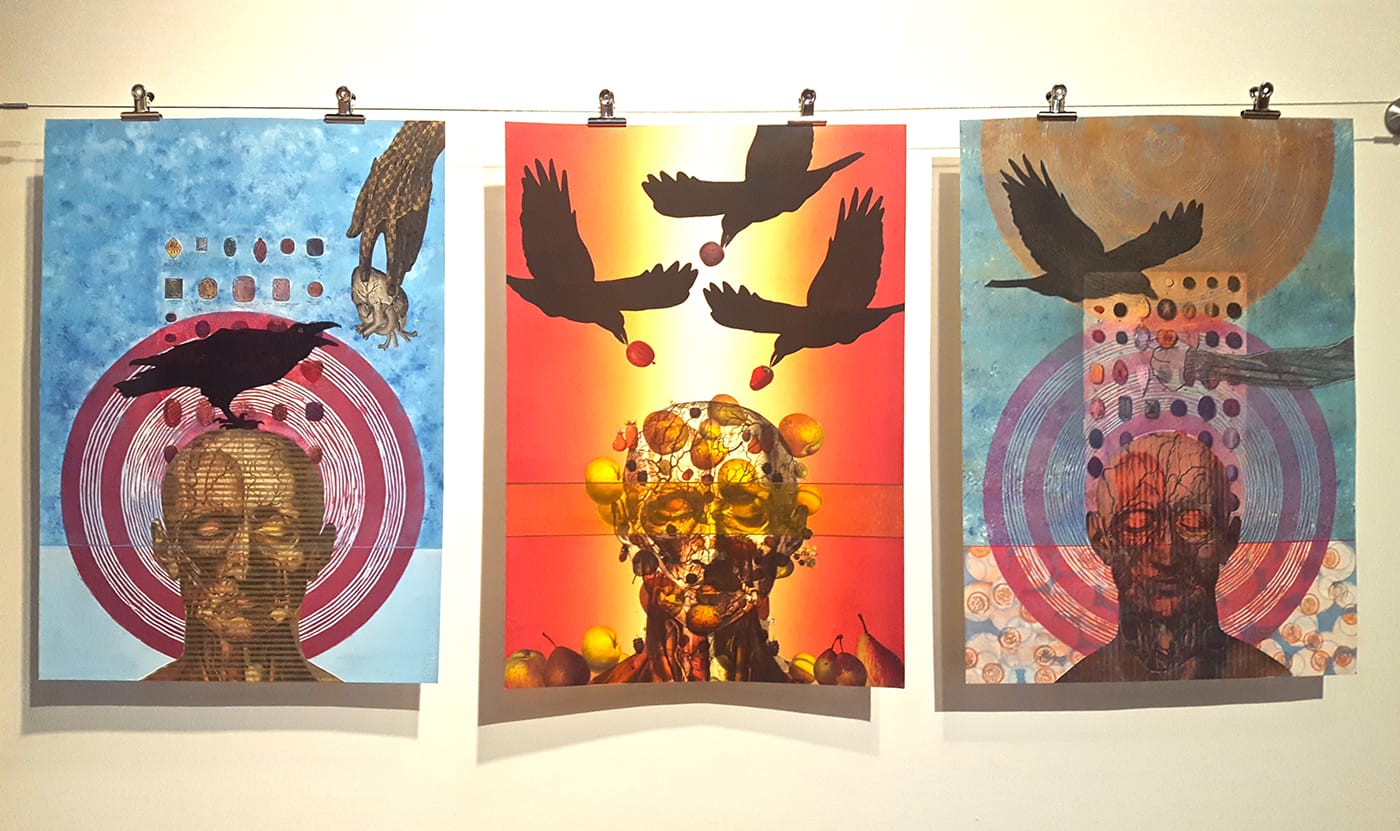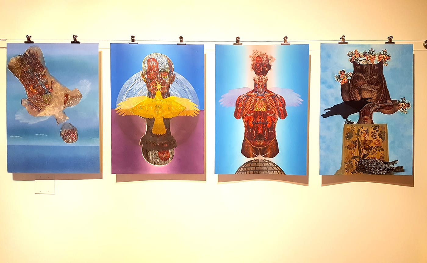 The exhibition is also replete with Catholic imagery — a nod to Gutoskey’s personal religious background — and Buddhist motifs, among the more abstract or pagan symbolism. Crows spiral from the chest of a meditating Buddha, or flock from a broken disco ball, or tornado from a splayed torso. Gutoskey’s carved-block elements interact with collage pieces from botanical catalogues and cards, creating gentle visual puns (“I’m always good for a fruit or pansy joke while I’m working,” he quips). Despite playing across a range of imagery and palettes, the final presentation is extremely unified, successfully presenting a crowd of individuals. Gutoskey’s tribute is as vibrant and beautiful, and shot through with chaos, as the victims whose lives and bodies were broken to pieces two years ago — and perhaps offers those who continue to live with the tragedy a visual language with which to express their grief.
