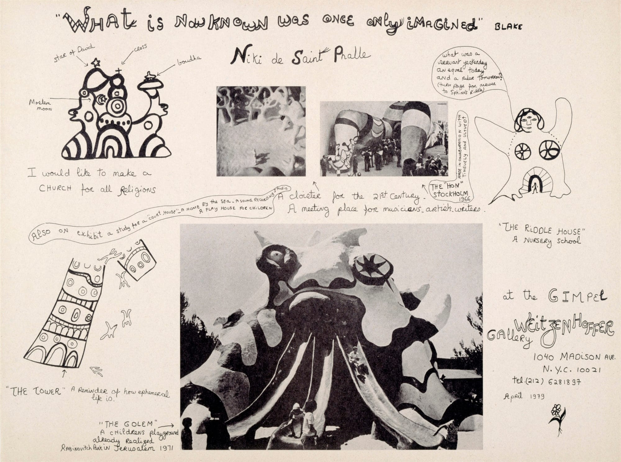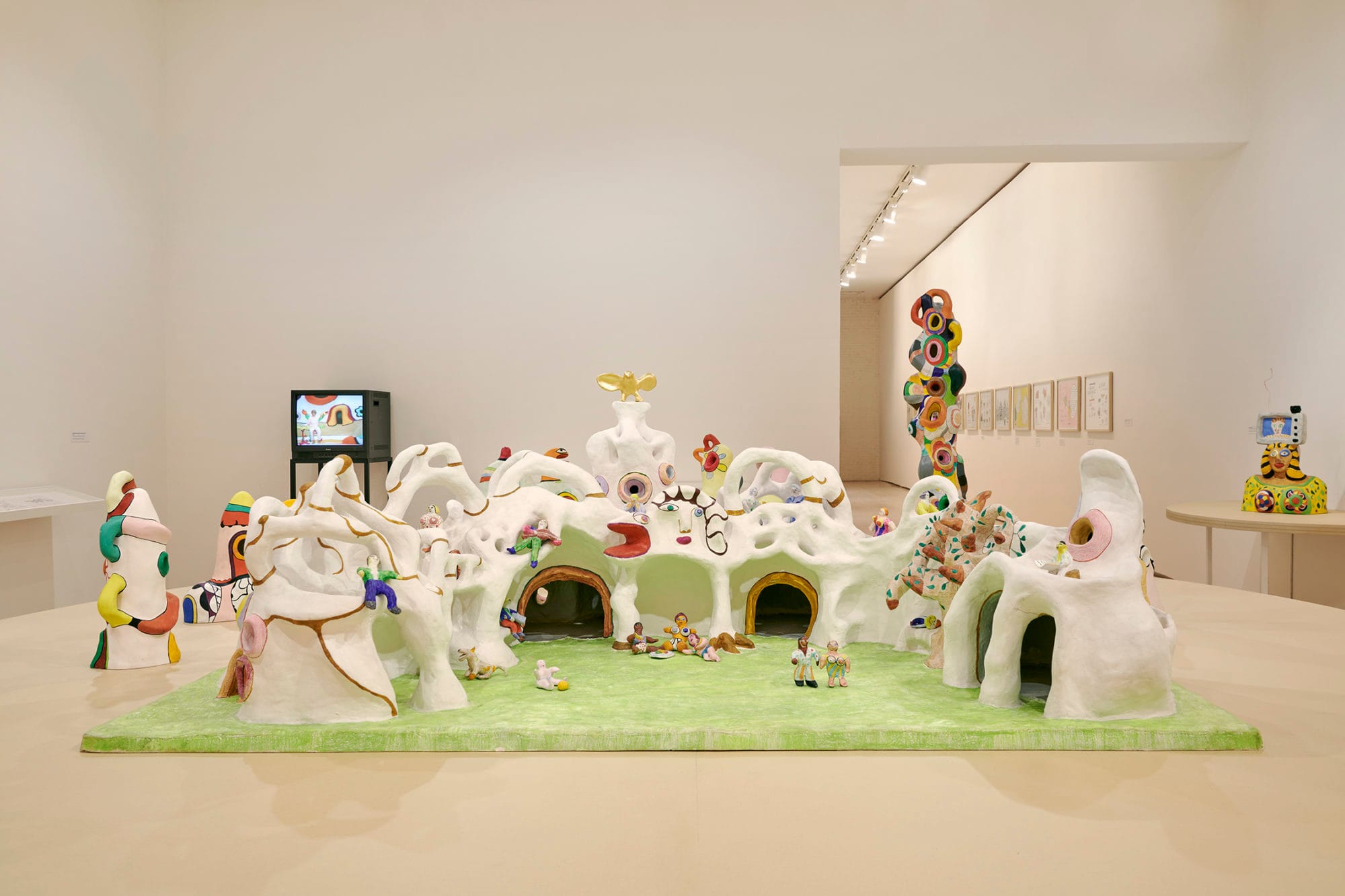 In response to these horrors, Saint Phalle invites us to imagine a new matriarchal world premised upon acts of nurture and bonds of collectivity. The Nana houses and infamous Nana cathedral exhibited in Stockholm in 1966 best illustrate such possibilities, and are imbued with joy and humor, performativity and collaboration. They disavow the societal binaries that limit women to the status of Madonna or whore, and, by extension, undercut the heavy-handed readings that critics have applied time and again to Saint Phalle and her art. Thanks to its non-chronological approach and deep plunge into the artist’s wider world, Structures for Life frees Saint Phalle from the triadic body-beauty-biography interpretative lens that reduces her to a feminist painter and sculptor. In fact, Saint Phalle dreamed much bigger and at times, her dreams became reality.