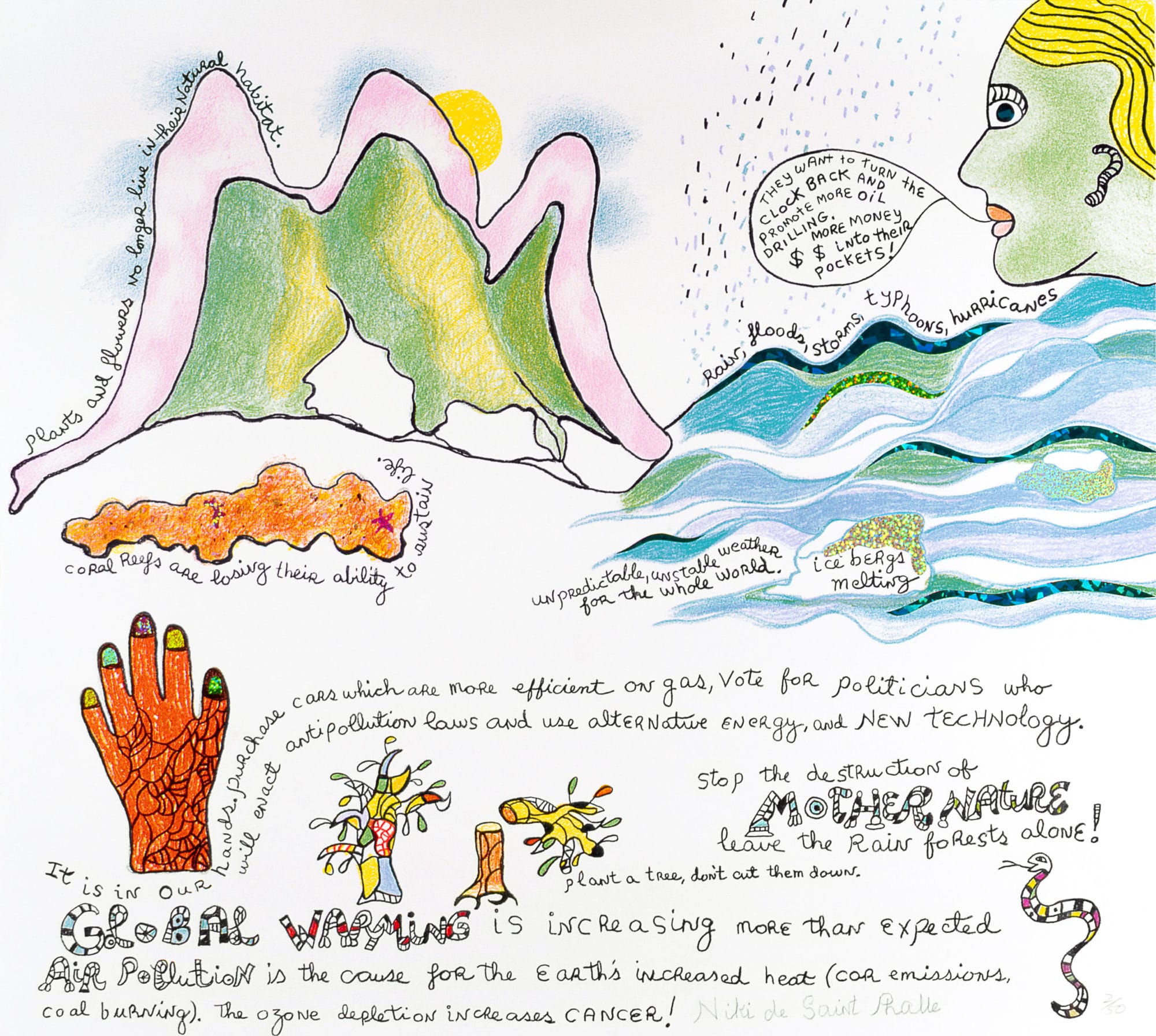 Extending focus to smaller, sensory objects, Structures for Life exhibits Saint Phalle’s designs for jewelry and perfume in an antechamber to the main gallery. The curators situate the production of these wares in the lineage of multiples and as ingenious funding schemes for the creation of Saint Phalle’s larger projects, simultaneously enabling a range of admirers to own her art and liberating the artist from the bonds of patronage. But they also illustrate a translation in scale from totemic sculptures to talismanic objects worn on the body, perhaps as armor or, as Saint Phalle labeled them, lucky charms. The artist’s world is framed as both intimate and expansive, with personal gestures balancing the louder, monumental interventions. Dispersed throughout the exhibition, a series of illustrated letters to her friend, Clarice Rivers, underscore the importance of writing to Saint Phalle’s psyche and practice. Inscribed and colored with a childlike hand, these missives seem to serve a diaristic or therapeutic purpose, making the addressee at once private and public.
