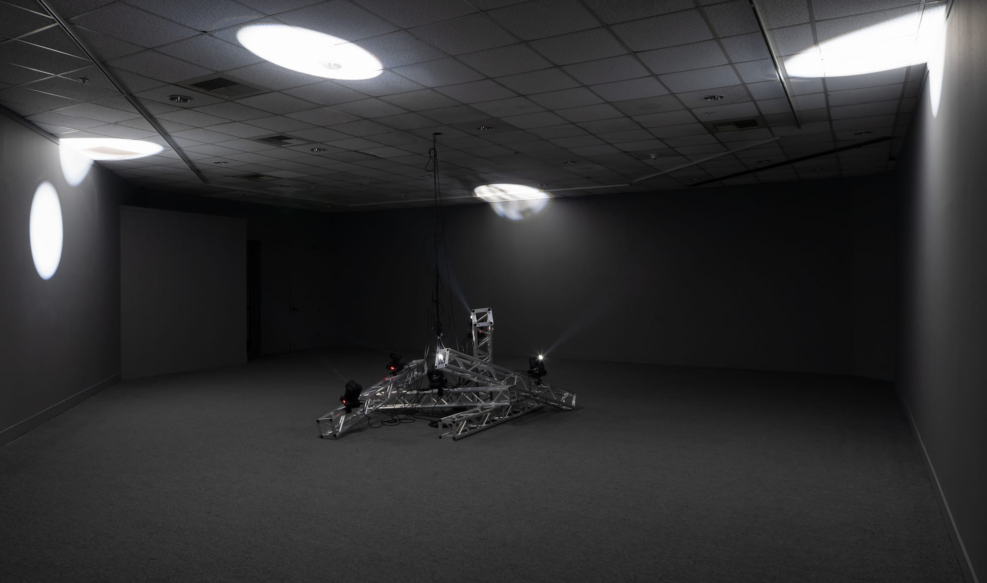 Situated in one of CAAM’s smaller galleries and curated by the museum's executive director Cameron Shaw, Gale’s exhibition provides an inverse image to the boisterous concert footage that peppers the documentary. There are no hysterical fans or pulsing music. Instead, entering the gallery feels like crossing into a twilight dimension, where I am greeted by an enveloping darkness and a flurry of spastic spotlights. Five theatrical lighting trusses are arranged haphazardly in the middle of the room, as if the equipment were the leftover rubble from some accidental collapse. Various stage lights are set up on top of the trusses, whirring around and spilling their illumination across the room. They seem to be, like me, in frantic search of the absent performer.