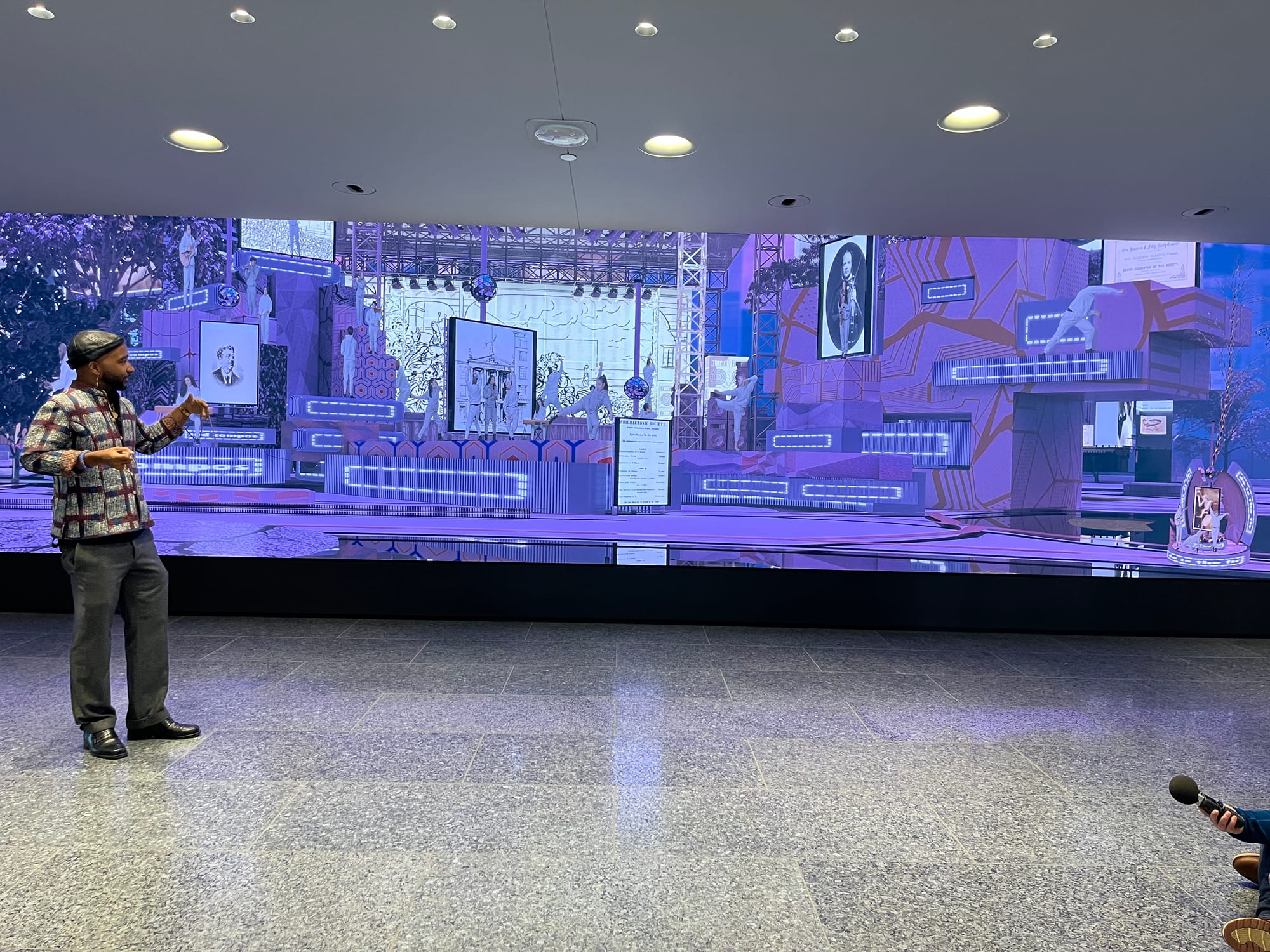 The second commission is a 27-minute video designed for a 50-foot-long media wall in the lobby, exploring a utopian landscape where New York City’s past and future meld to produce a more equitable and vital vision of artistic life. The video will be on display whenever the media wall is not being used to livestream performances taking place within the hall.