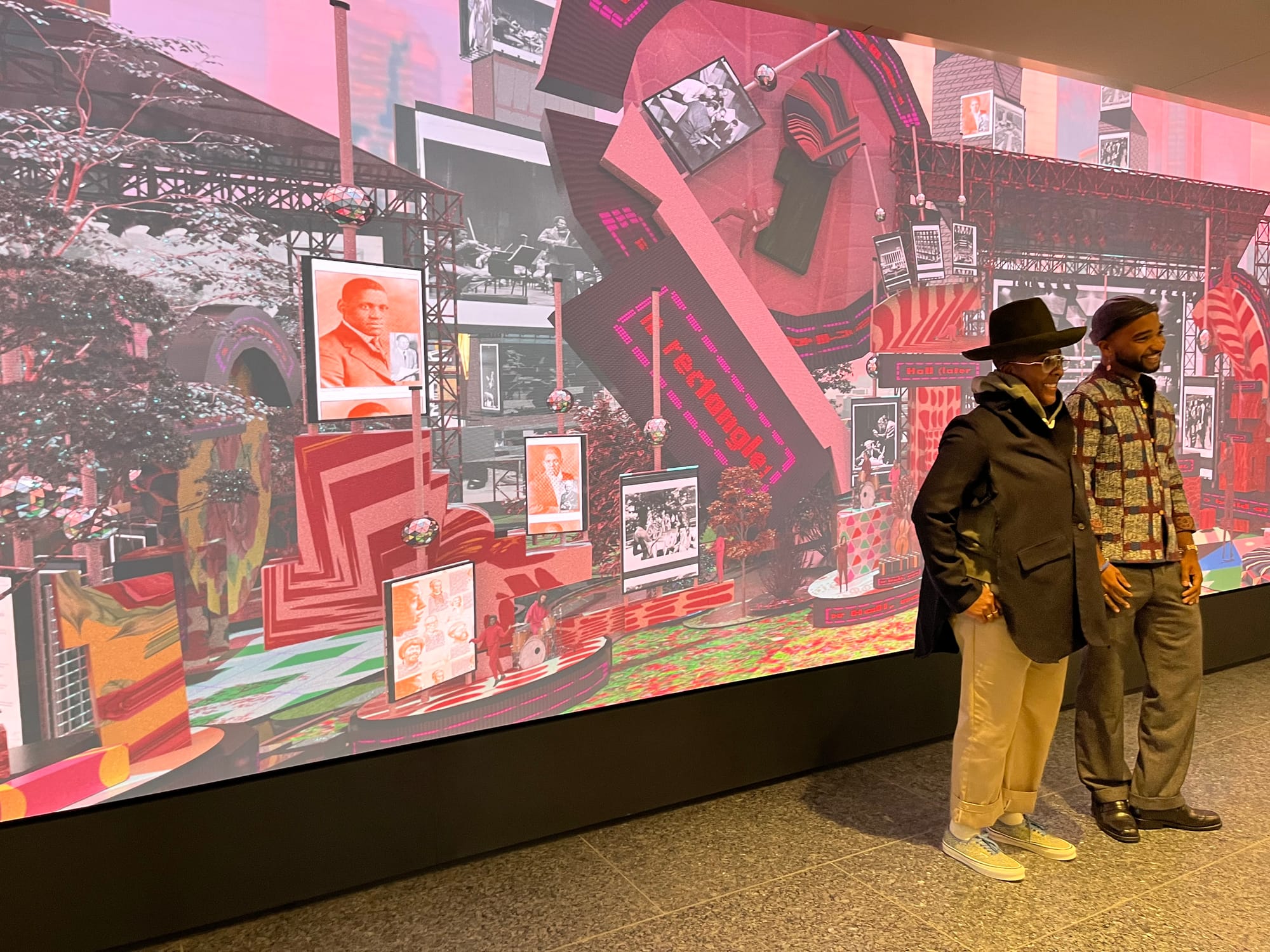 “I wanted to figure out how to make a digital quilt inside this landscape inspired by Central Park, to be a love letter to New York and its creative output,” said artist Jacolby Satterwhite. The digital piece, titled “An Eclectic Dance to the Music of Time,” features 120 dancers and musicians from the city’s performing arts schools, personally choreographed by the artist. They dance on platforms and outdoor stages set against an imaginary backdrop of sculptures, foliage, and skyscrapers. “What would it be like to allow them to see themselves as future performers of the Philharmonic in Lincoln Center?” Satterwhite posed on Saturday.