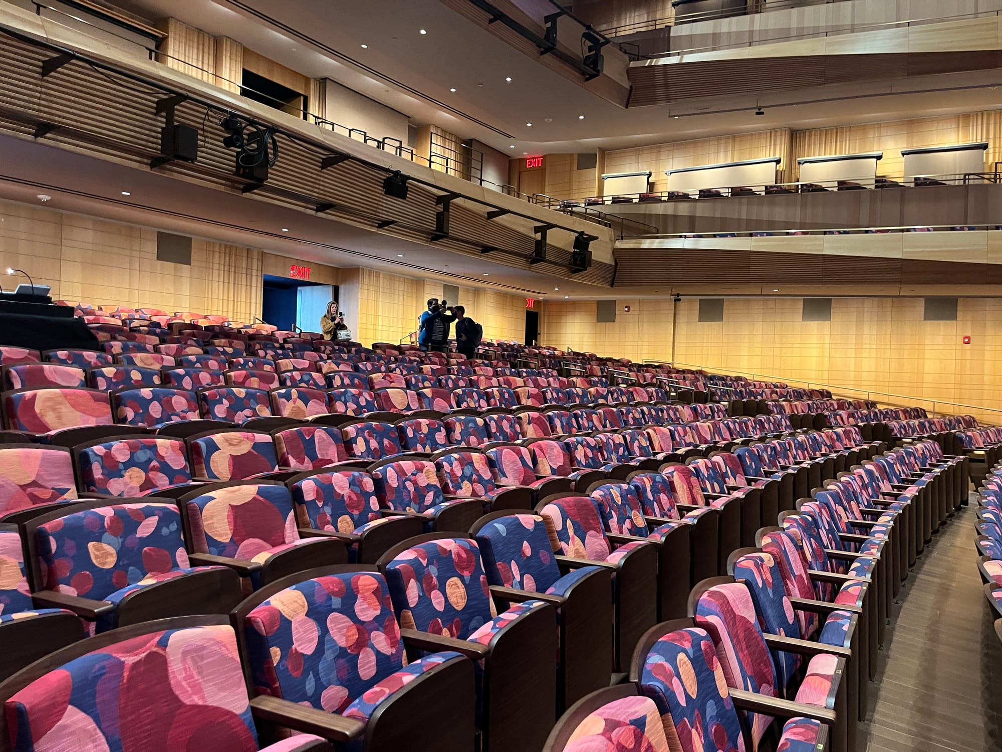 The Geffen Hall retains its architectural exterior, designed by Max Abramovitz and first opened in 1962. The hall’s $550 million redesign was undertaken in large part to remedy the prior one’s notorious acoustic problems, and the new hall is smaller, with an added coffee shop, restaurant, welcome area, and sidewalk studio for community events. One aesthetic feature that particularly disarmed visitors on Saturday was the matching rose petal design that decorated both the outer walls of the theater and the seats inside. “Who would think to match the seats and the walls inside?” Senate Majority Leader Chuck Schumer said smilingly to the public spaces architect on the project, Tod Williams, as he filed out of the hall.