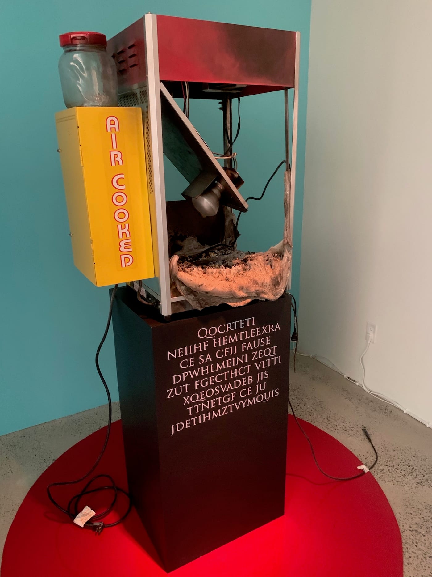 Here, Katchadourian went to town with the first machine’s final, agonizing words, among which are “QOCRTETI NEIIHF HEMTLEEXRA CE SA CFII FAUSE.” She enlisted experts. An opera singer, familiar with tragic death scenes, sings the lines of gibberish. A poet/lawyer compares them to the last words of death row inmates. A birth and death doula focuses on grief, empathy, and acceptance, acknowledging Katchadourian’s very real grief following the “death” of her talking artwork which once called her “mom.” Katchadourian excels at investing commonplace, inanimate things with vitality and soulfulness.