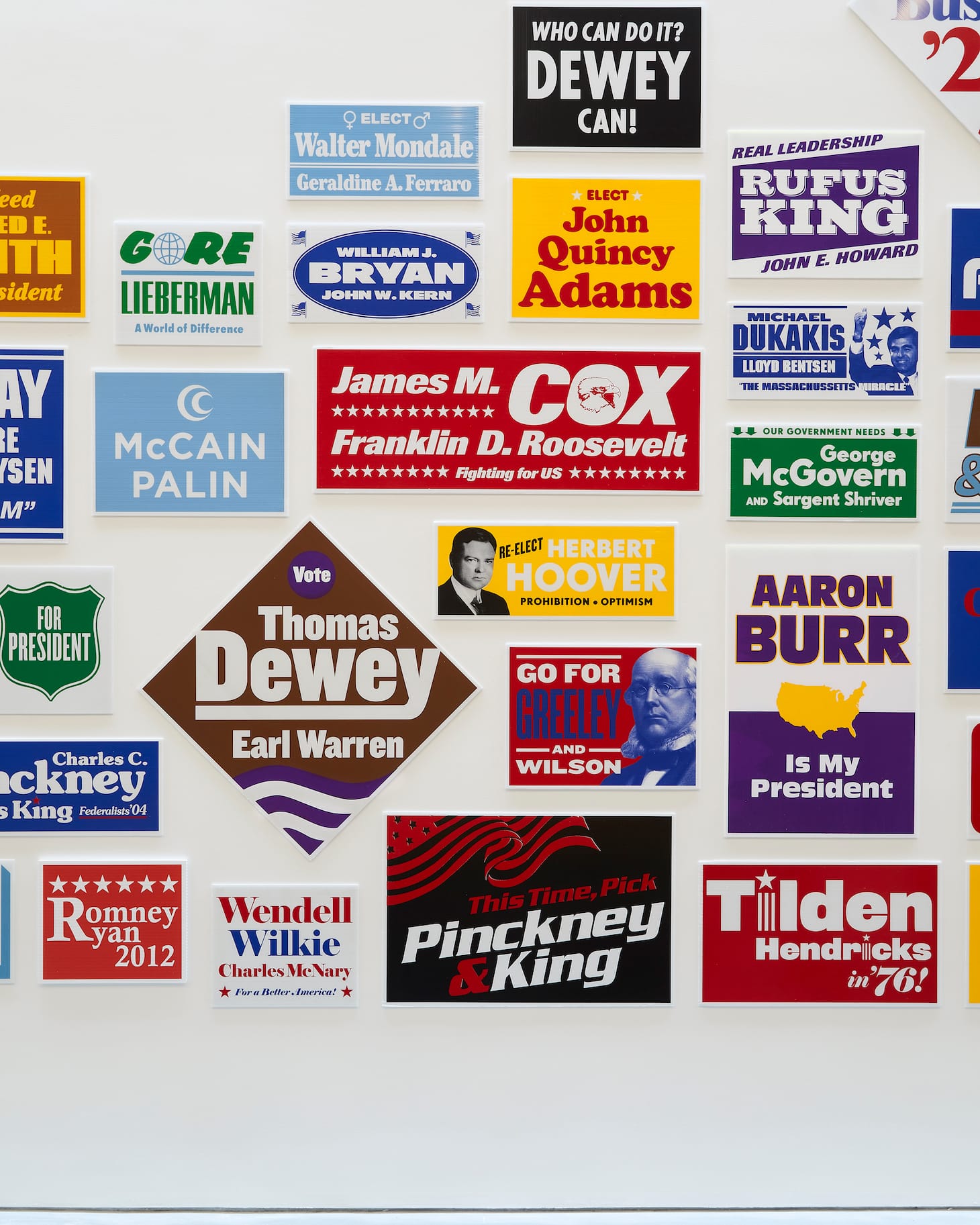 Inspired by the plastic signs that decorate American lawns in the months leading up to a presidential election, the Armenian-American artist Nina Katchadourian decided to materialize the country’s political “road not taken” by creating an installation of signs bearing the names of candidates who have lost. Since 2008, this ongoing project, titled Monument to the Unelected, has been exhibited every election cycle — Hillary Clinton’s sign being the most recent addition.