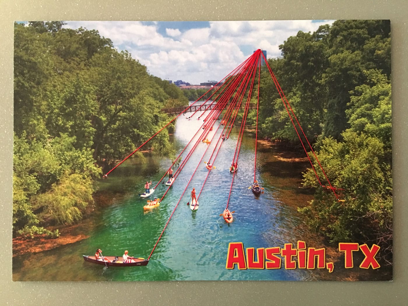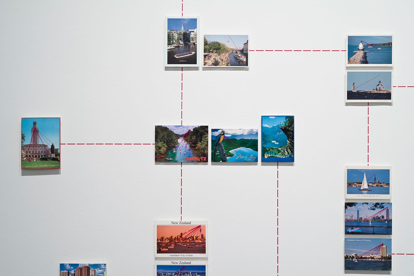 For Paranormal Postcards (2001–ongoing), which now totals 353 pieces, Katchadourian alters postcards by stitching together various elements in each one with red thread. They’re then grouped together in arbitrary categories (plazas with flagpoles, bridges at sunset), and Katchadourian connects the groups with an elaborate network of dotted red lines on the wall. Hers is a zealously mapped-out worldview of farcical interconnectedness.
