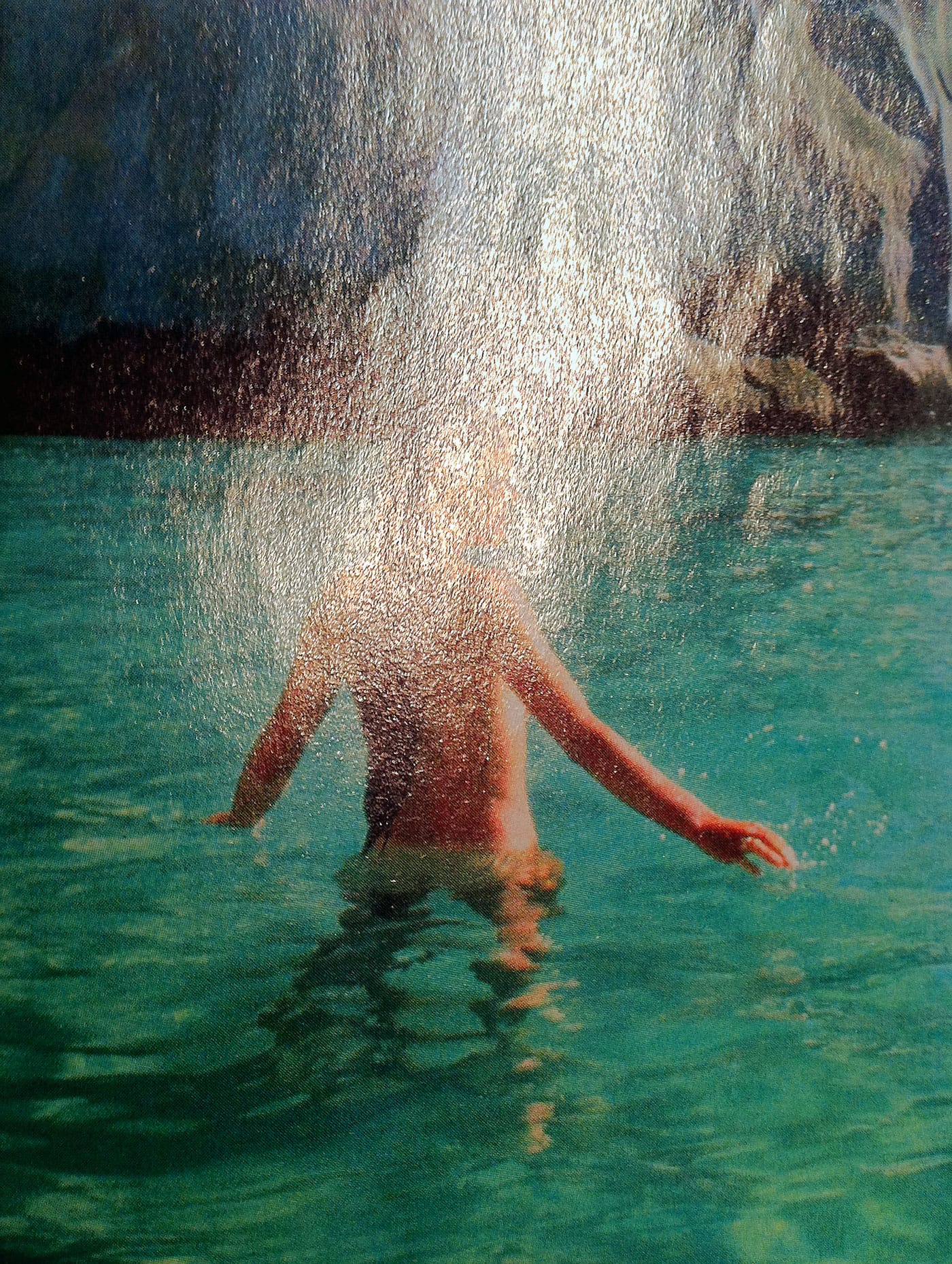 More unsettling and complex are the Seat Assignment photographs made when the artist limits herself to whatever materials she has access to while confined to her seat: in-flight magazines, the seat belt, snacks offered by flight attendants. When Katchadourian plops a lemon wedge on an image of a baseball field, scale becomes jarringly inverted and the fruit slice becomes an enormous abstract sculpture. Even the glare cast by the overhead reading light transforms a typical travel magazine photo of woman swimming into something ethereal.