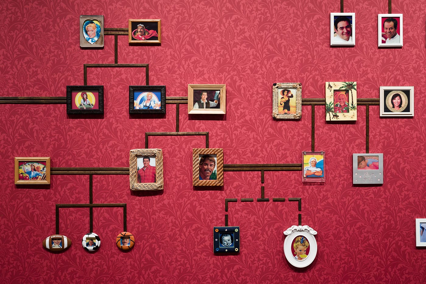 A similar logic is at work in The Genealogy of the Supermarket (2005–ongoing), a bizarre family tree comprised of product icons displayed in kitschy frames and splayed across fussy red wallpaper, as if in some supermarket-size living room. Aunt Jemima and the Quaker Oats man are parents to the Cream of Wheat chef, while the Gerber Baby is the adopted child of same-sex couple Mr. Clean and the Brawny Towels man. Katchadourian takes the advertising emblems at face value and a fantasy of lineage to an oddly logical conclusion. We’re supposed to believe these characters are real, so why wouldn’t they be related?