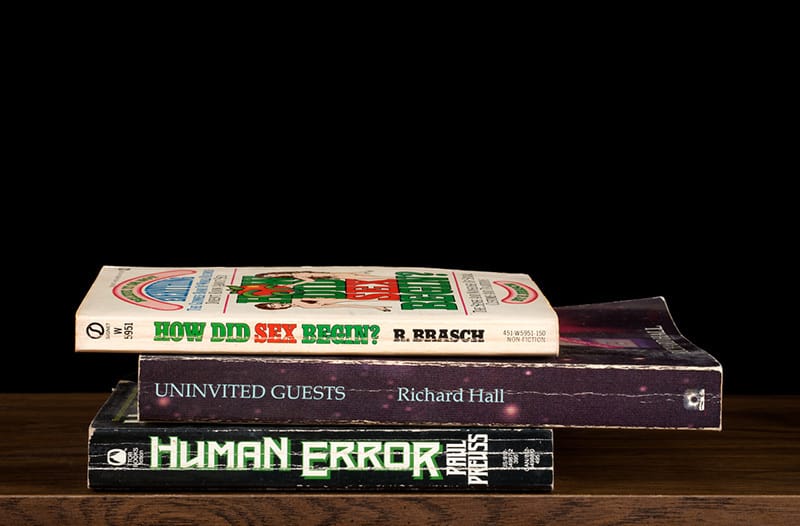 For Sorted Books, Katchadourian mines people’s personal libraries, selecting volumes and stacking them so that the spines produce enigmatic or coy phrases. The resulting photographs — shot against deep, black backgrounds and printed in exquisite resolution — impersonate formal portraits. But of course, Katchadourian contradicts that formality with her irrepressible urge to play. Reads one stack culled from the shelves of Beat poet William S. Burroughs: “How did sex begin? / Uninvited guests / Human error.” (Chronicle Books published a monograph of Sorted Books in 2013.)