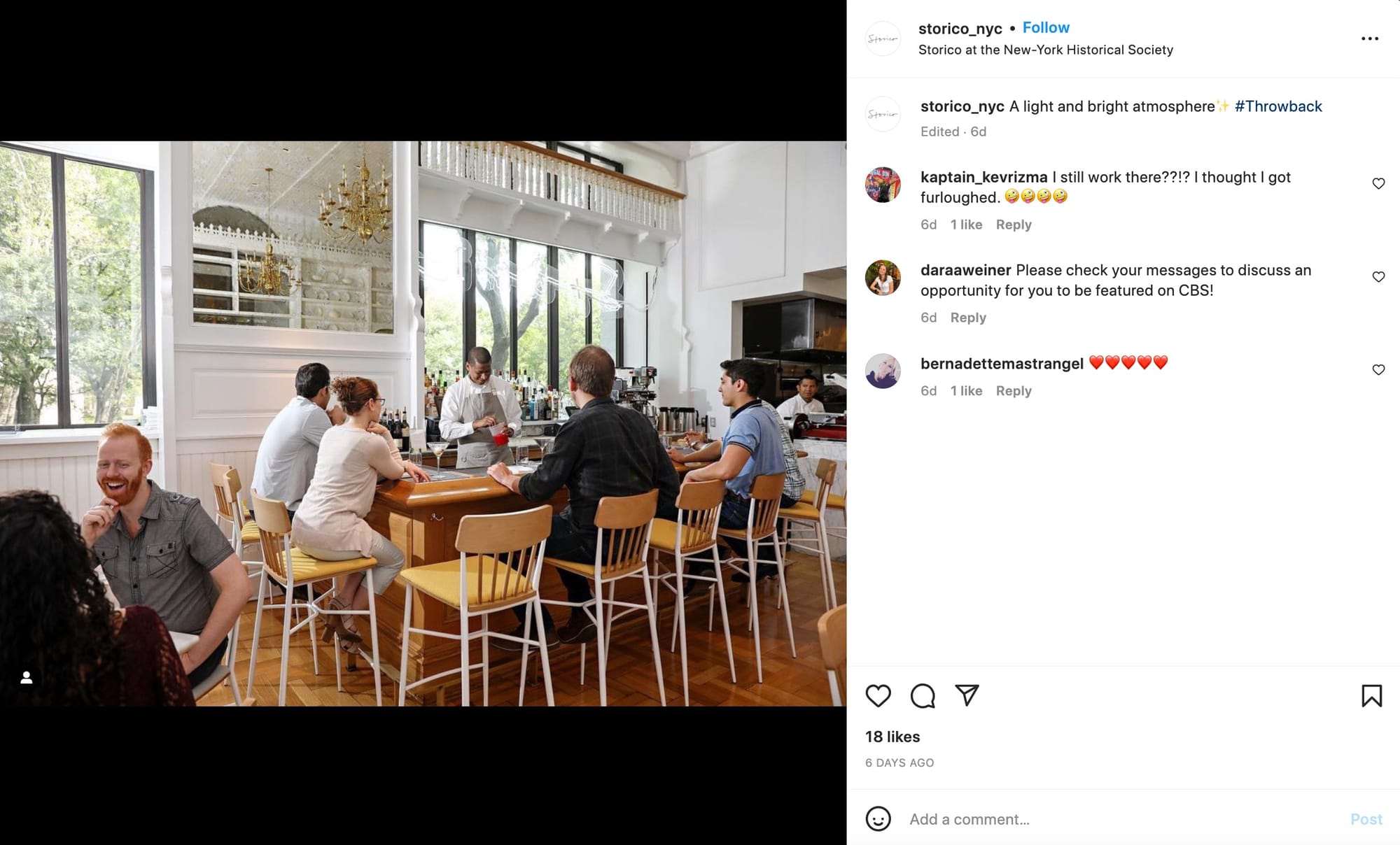 Storico restaurant offers seasonal brunch, lunch, and dinner menus with desserts and cocktails in a bright environment with lots of windows and accents that I'm sure someone would call "farmhouse chic." The offerings are pretty standard, including but not limited to Caesar salads, Faroe Island salmon, mushroom pastas, and a chicken parmesan sandwich.