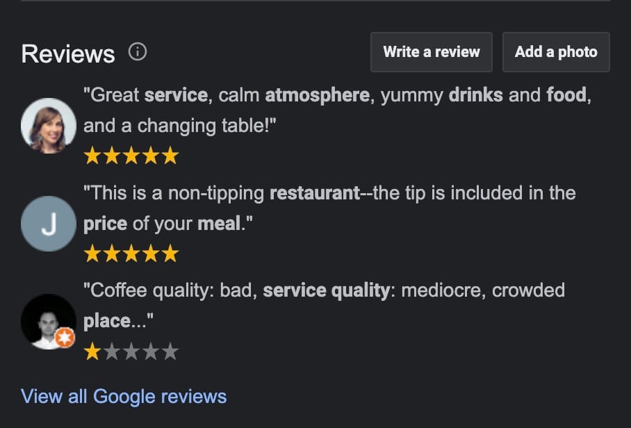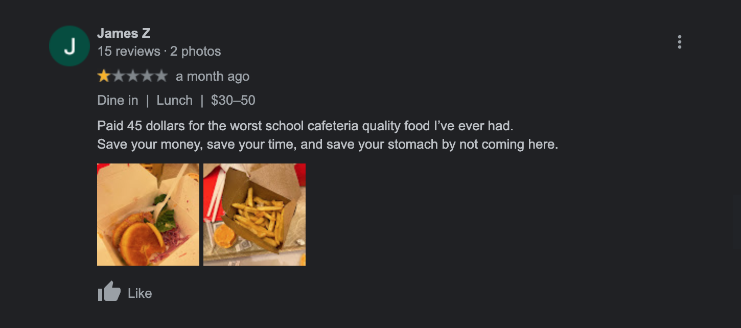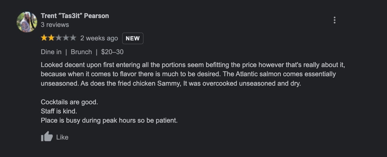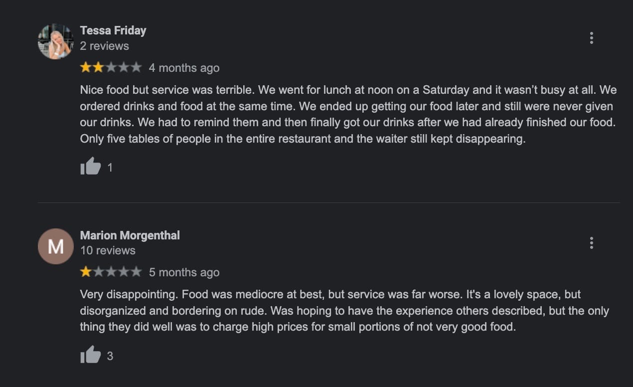 The reviews on OpenTable are pretty complimentary, but everyone knows that Yelp and Google reviews are where the mask comes off and the claws come out.