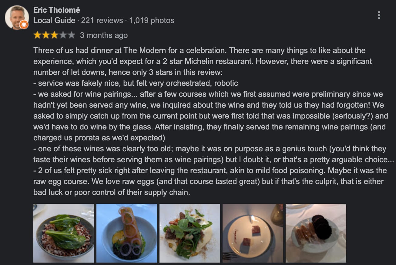 To be fair, the lunch menu is only $150 per person. But if that extra $100 you saved is burning a hole in your pocket, you can always add the white truffle tagliatelle. Regardless, it seems that most people have had an overwhelmingly positive experience dining at the Modern. Most reviewers across Google, Yelp, and TripAdvisor laud the restaurant for its "inventive" culinary excellence and exceptional service. Nevertheless, even Michelin-star restaurants have bad days, too.