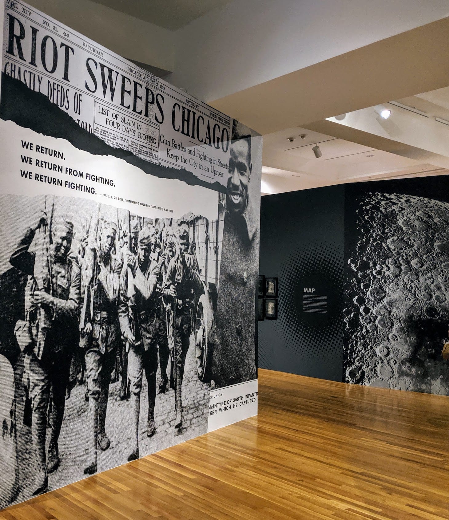 This tragic yet all too familiar reality is depicted on the opposite wall covered with a black-and-white photograph of African American soldiers marching with rifles casually slung over their shoulders. Above them is the headline “Riot Sweeps Chicago,” and beneath it are the words, “List of slain in four days rioting.” Far from an isolated incident, racially charged riots, better described as mass lynchings, were perpetrated by white supremacist terrorists across the United States, taking the lives of hundreds of African Americans during what came to be known as the Red Summer.