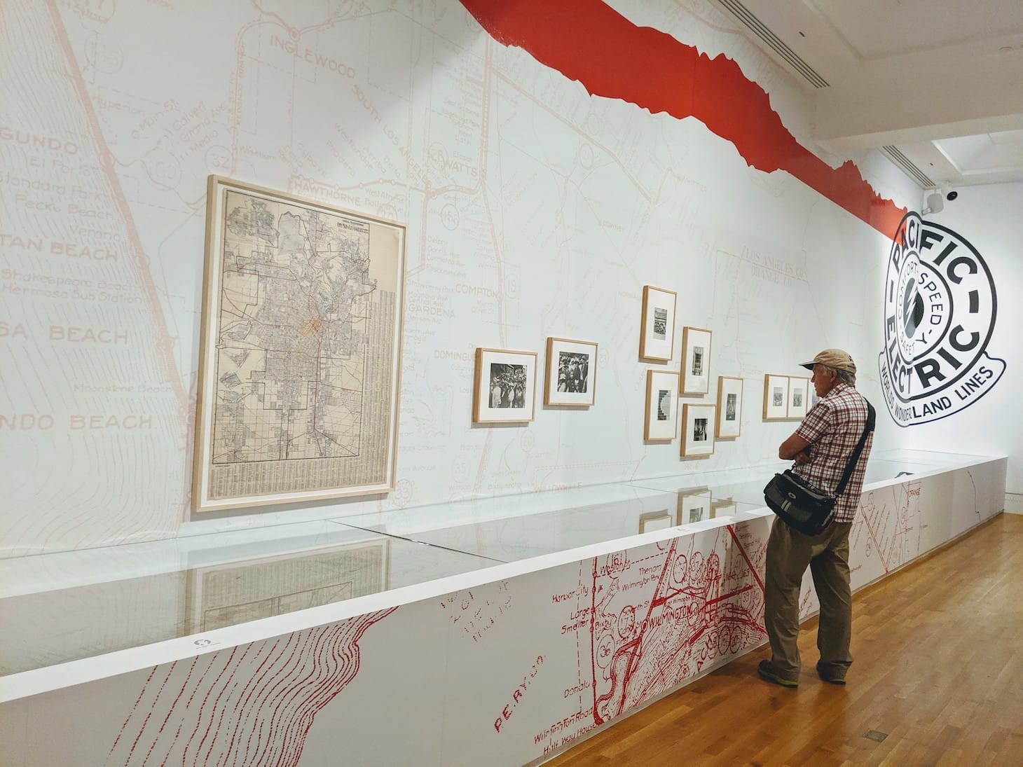 All of this is backgrounded by the founding of the Huntington Library in 1919 by Henry and Arabella Huntington. Railroad baron and prodigious real estate investor, Henry Huntington shrewdly combined his two industries by creating a network of trolleys that drove development toward his land holdings. A map of this early public transportation system occupies the entire back wall of the main gallery and, to a large degree, still reflects that socioeconomic boundaries of Los Angeles. As with many instances in this era, what was progress for some in terms of increased mobility and therefore access to economic opportunity, meant the opposite for many others, most of whom were minorities, as Huntington’s famed Red Cars never reached anywhere near their doorstep.