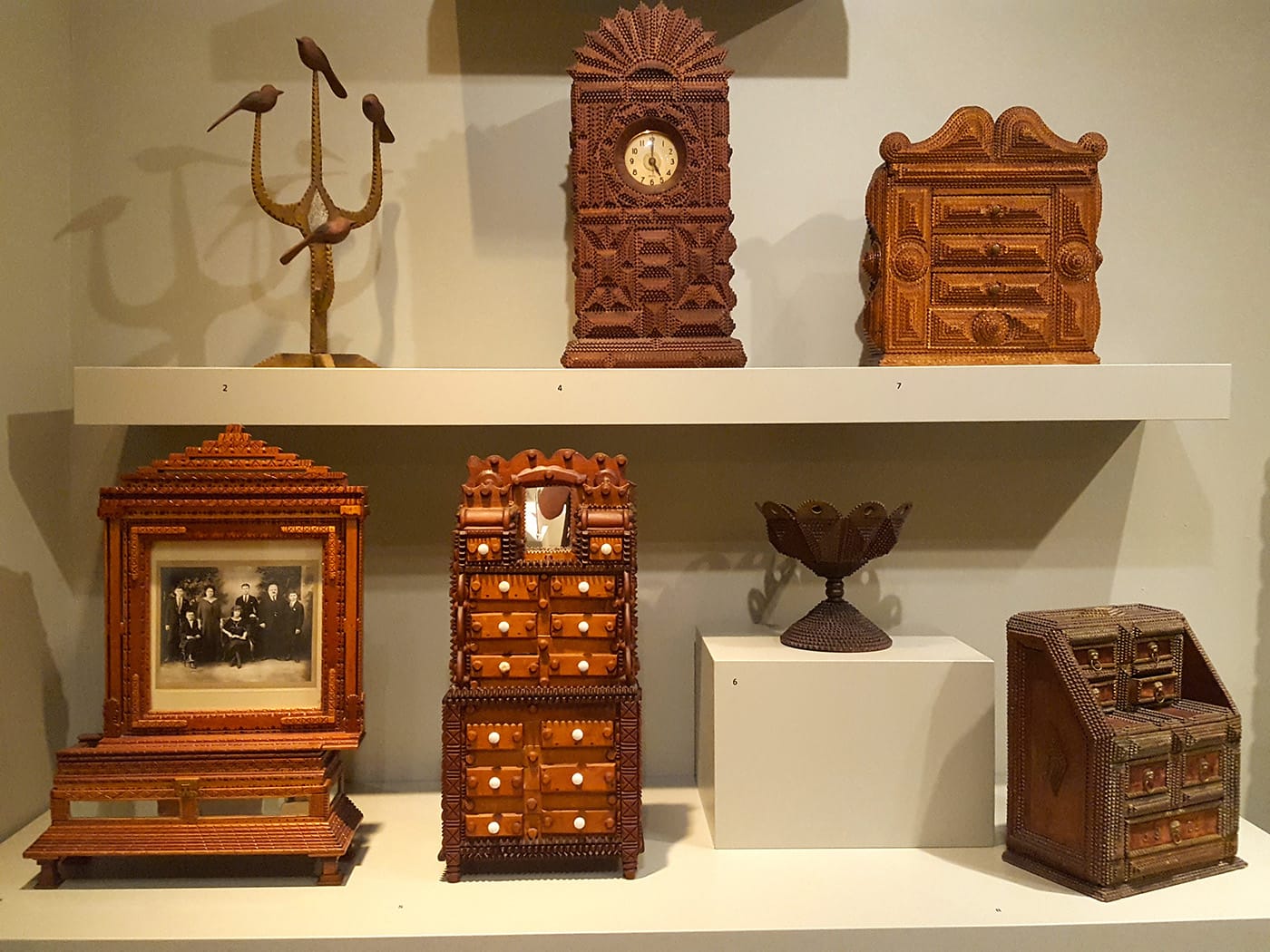 “In my theorizing, I tend to lean toward a European origin,” said Addison, during the interview, “There are a number of examples in the show from France, and from elsewhere in Eastern Europe, but I do think tramp art has its own story in the United States.”