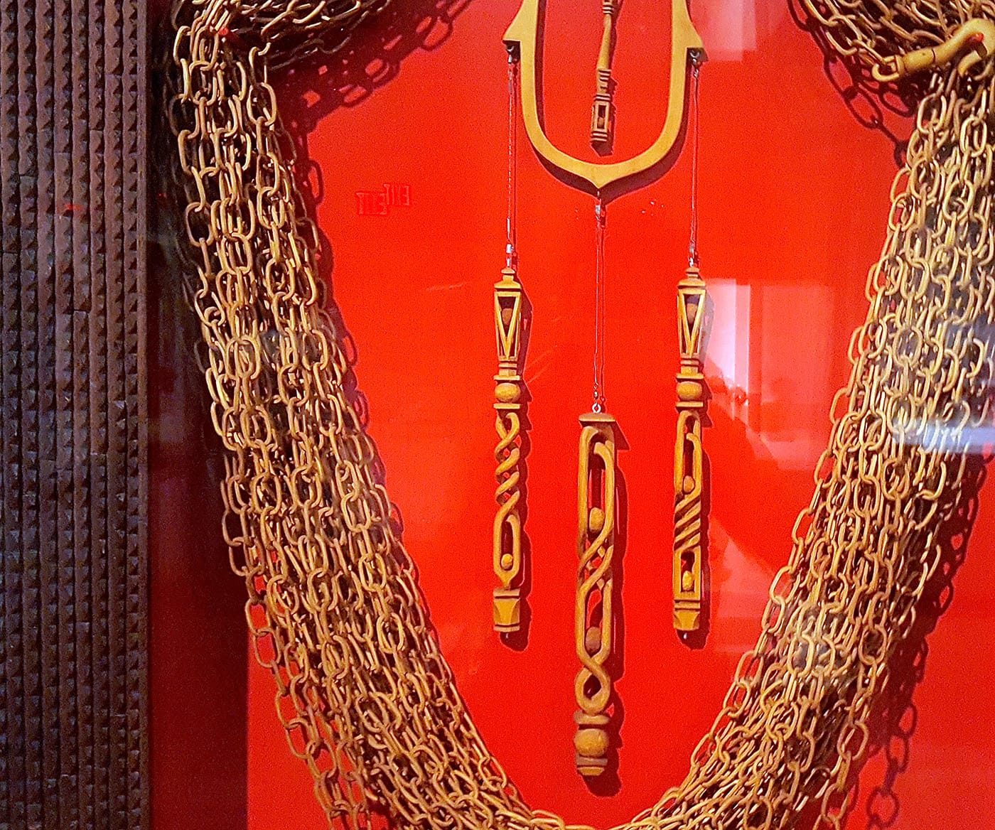 No Idle Hands is also a demonstration of tramp art’s astounding virtuosity. Some whittled works demonstrate incredible precision in carving, such as in long loops of wooden chain-link, where the interlocked forms are carved out of whole pieces (rather than pieced together, as metal chain-link would be). Clever tramp artists were able to carve astonishing ball-in-joint mechanisms or ball-captures from single wood blocks, creating kinetic pieces out of a once solid base material. These chains seem to serve no earthly purpose, but for a kind of quiet bragging by the practitioners of this humble craft.