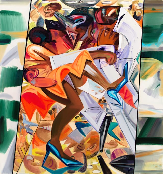 In the first “Fight in an Elevator,” it is apparent that Schutz identifies with Solange, who is seen kicking and punching the white-suited male (the figure of patriarchal authority). She is in a snit because of all the constraints that have been placed on her. There is an anarchic side to Schutz that she refuses to suppress in order to become decorous, polite and well-mannered. Chaos and order, structure and disorder animate these paintings with an unrivaled vitality.