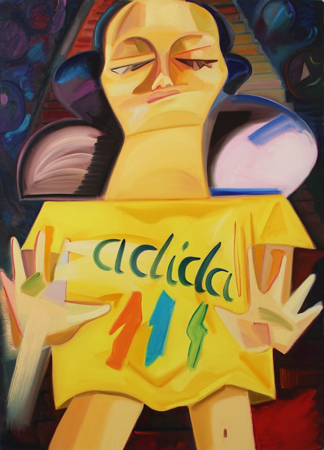 Look at the painting closely and you will see that the sharply curved shapes of the dress’s upturned hem and the upside-down reflection of the man’s head in the elevator’s mirrored floor are among Schutz’s many pastiches of (and homages to) Pablo Picasso and Georges Braque, and the paintings they did between 1907 and 1909, before they initiated what is known as Analytic Cubism. In “Sleepwalker” (2015), a young woman wearing a yellow t-shirt with ADIDA spelled across the front has descends a staircase–shades of Marcel Duchamp–until she bumps into the transparent picture plane (the painting’s surface), which flattens her palms and face. Schutz wears her learning lightly. She doesn’t need to show off or name-drop. She is the opposite of Julian Schnabel. It is also clear that she doesn’t regard the past as a burden, something to be jettisoned or obliterated. This is the lesson she got from Philip Guston.