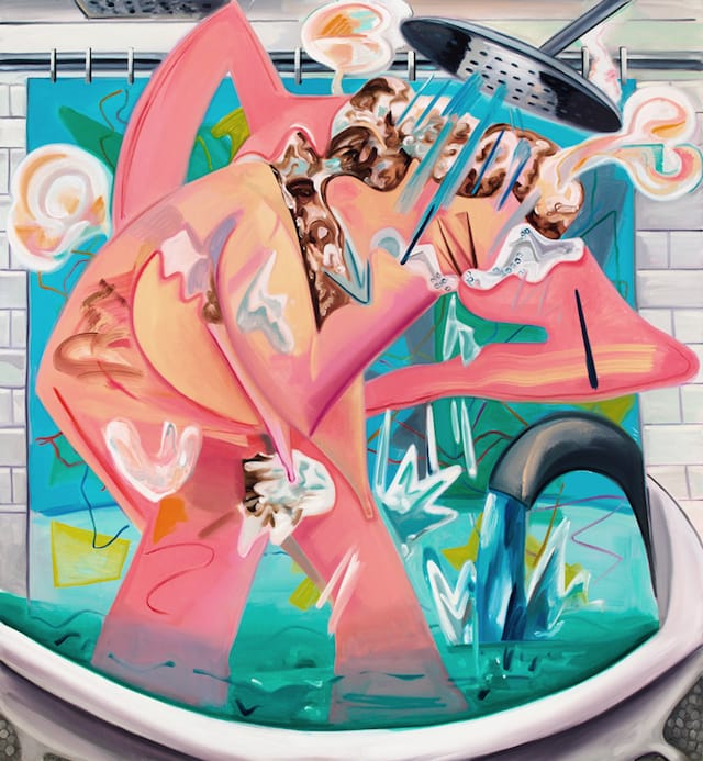 I was unexpectedly reminded of the wonderfully irreverent filmmaker Seijun Suzuki while looking at Dana Schutz’s painting, “Slow Motion Shower” (2015), which is included in her current exhibition, Fight in an Elevator, at Petzel (September 10–October 24, 2015). In his landmark film Branded to Kill (1967), Suzuki found ingenious ways to simultaneously subvert and call attention to Japanese censorship, which forbade nudity. In “Slow Motion Shower,” Schutz depicts a cloud of molar-shaped soapsuds over the figure’s genitals, which are located just below the center of the painting. The soapsuds help obscure whether the figure is male or female, which makes the painting funny and to the point in a world obsessed with defining gender.