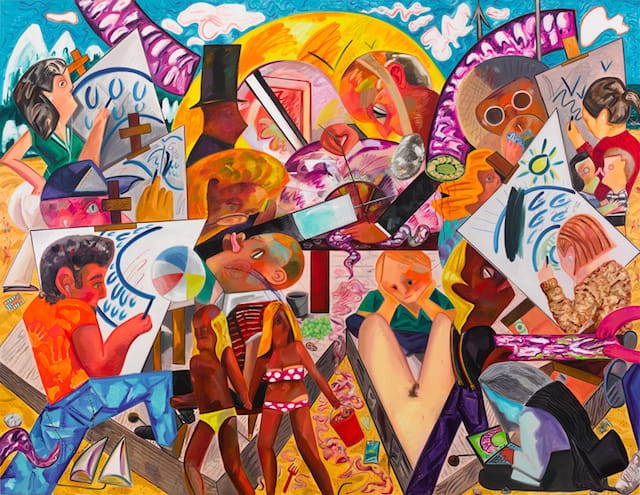 What about the handprints on the back on the bare-chested male kneeling in the painting’s lower left hand corner? Yes, the ocher color suggests they are made of sand, but their shapes also recall cave drawings in the Dordogne region of southern France. How come there seem to be two shark’s teeth lying in the sand between his legs? These and other questions inevitably lead us deeper into the painting, opening up an interior space in which we can reflect upon all the different contradictions and incongruities of daily life that the work raises. The artist’s ability to orchestrate all the different parts of her painting, and to be attentive to each detail, is a pleasure to behold. In this exhibition, Schutz has done more than supersede her earlier work, more than come into her own. She has become a commanding artist that others will have to reckon with.