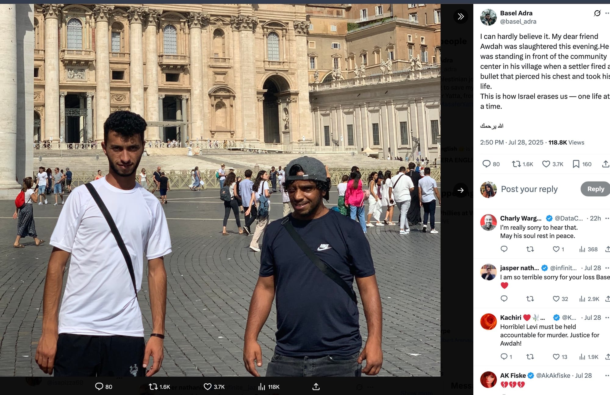 "I can hardly believe it,” co-director Adra, the film's main subject, wrote on X. “My dear friend Awdah was slaughtered this evening. He was standing in front of the community center in his village when a settler fired a bullet that pierced his chest and took his life. This is how Israel erases us — one life at a time.”