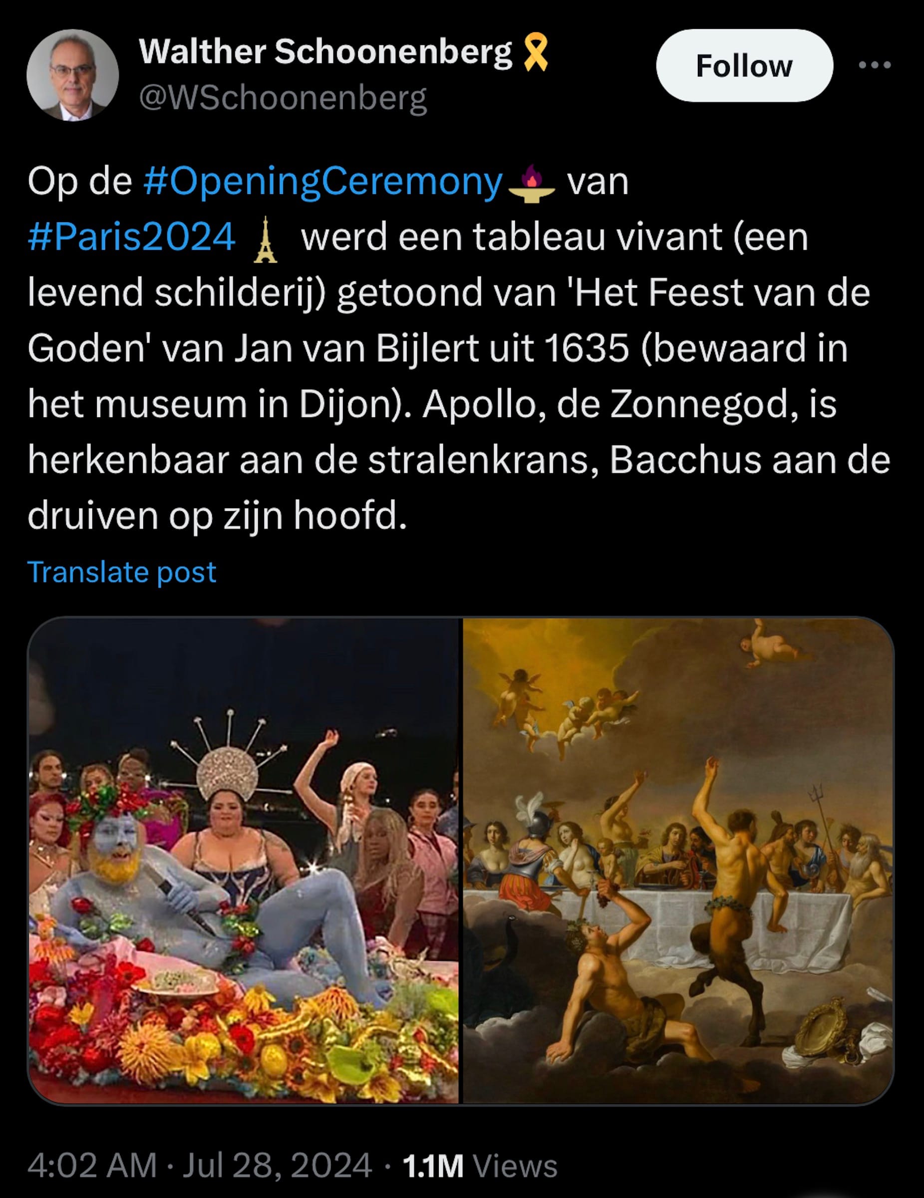 “First and foremost … [Bacchus] is the god of celebration in Greek mythology and the tableau is called ‘Festivity,’” Olympics ceremony Artistic Director Thomas Jolly said. “He is also the god of wine, which is also one of the jewels of France, and the father of Séquana, the goddess of the river Seine … The idea was to depict a big pagan celebration, linked to the gods of Olympus, and thus the Olympics.”