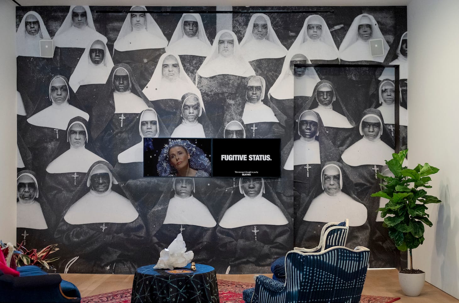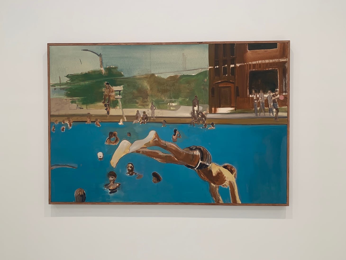 Wandering through the galleries again on a rainy afternoon, I overhear hushed discussions of magical realism and surrealist assemblage. Yet what strikes me most about the selection of Davis’s works is the sense of withholding they convey, alternatingly tongue-in-cheek, opaque, and otherwise imbued with a sense of refusal. Davis’s are works about Black people, made for Black people. His compositions, whether hazy, nostalgic, or sumptuously surreal, are of a world that is both familiar yet strange, one where no one’s performing unless for themselves.